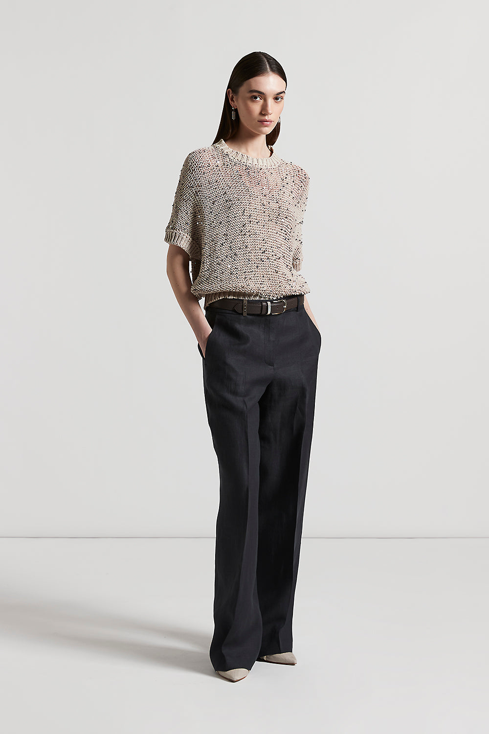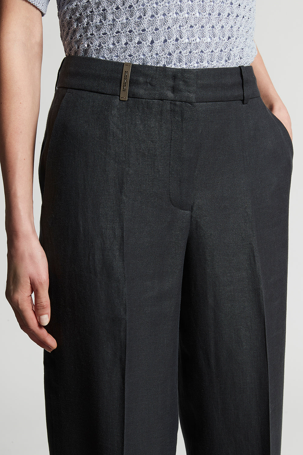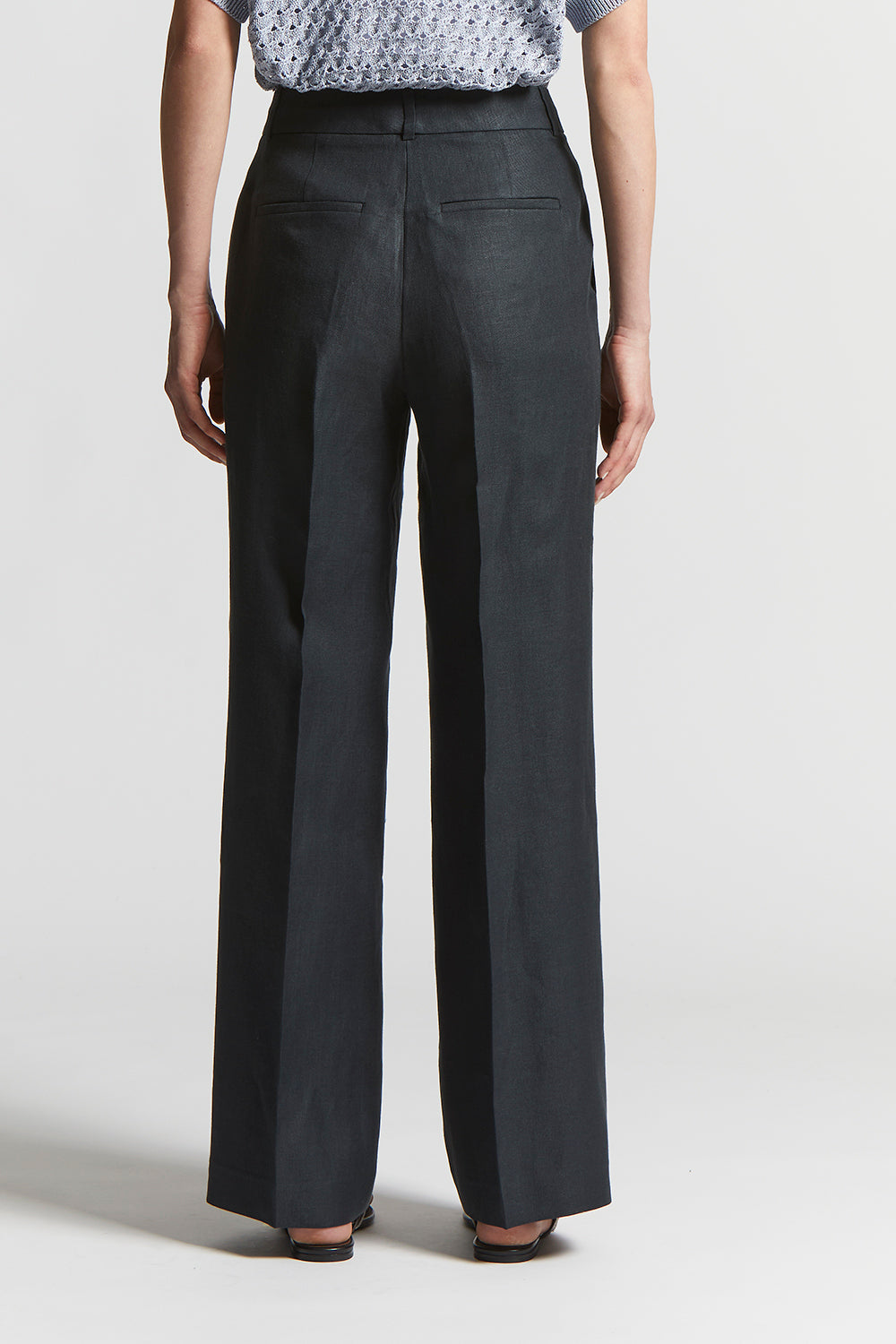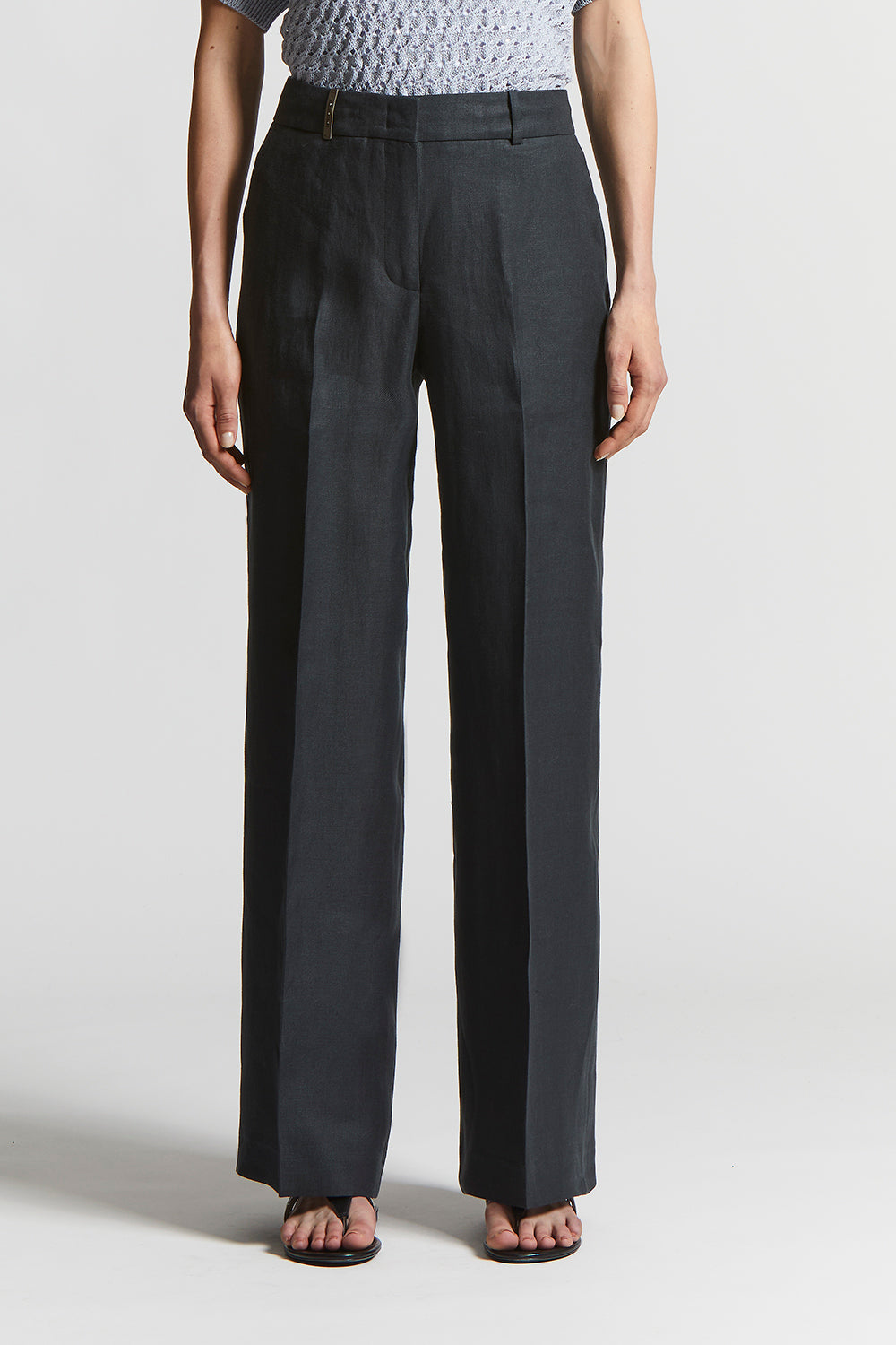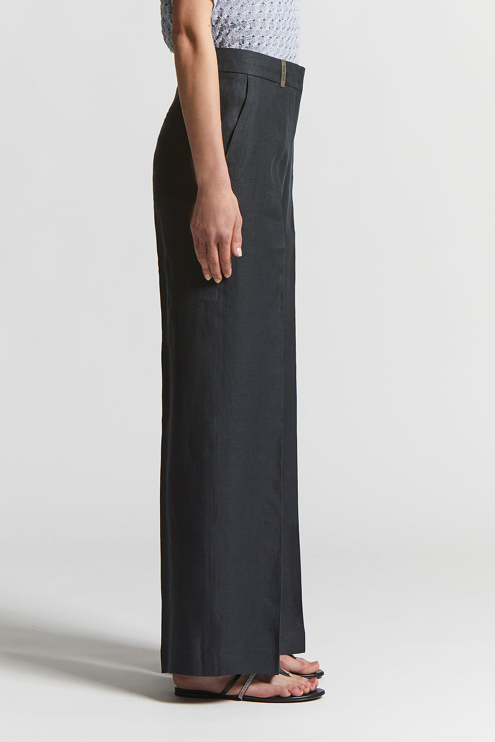 These trousers with wide preconstructed waistband are made of plain-coloured pure linen gabardine. The palazzo line and loose fit give the garment a natural fluidity, while the high waist gracefully defines the figure.