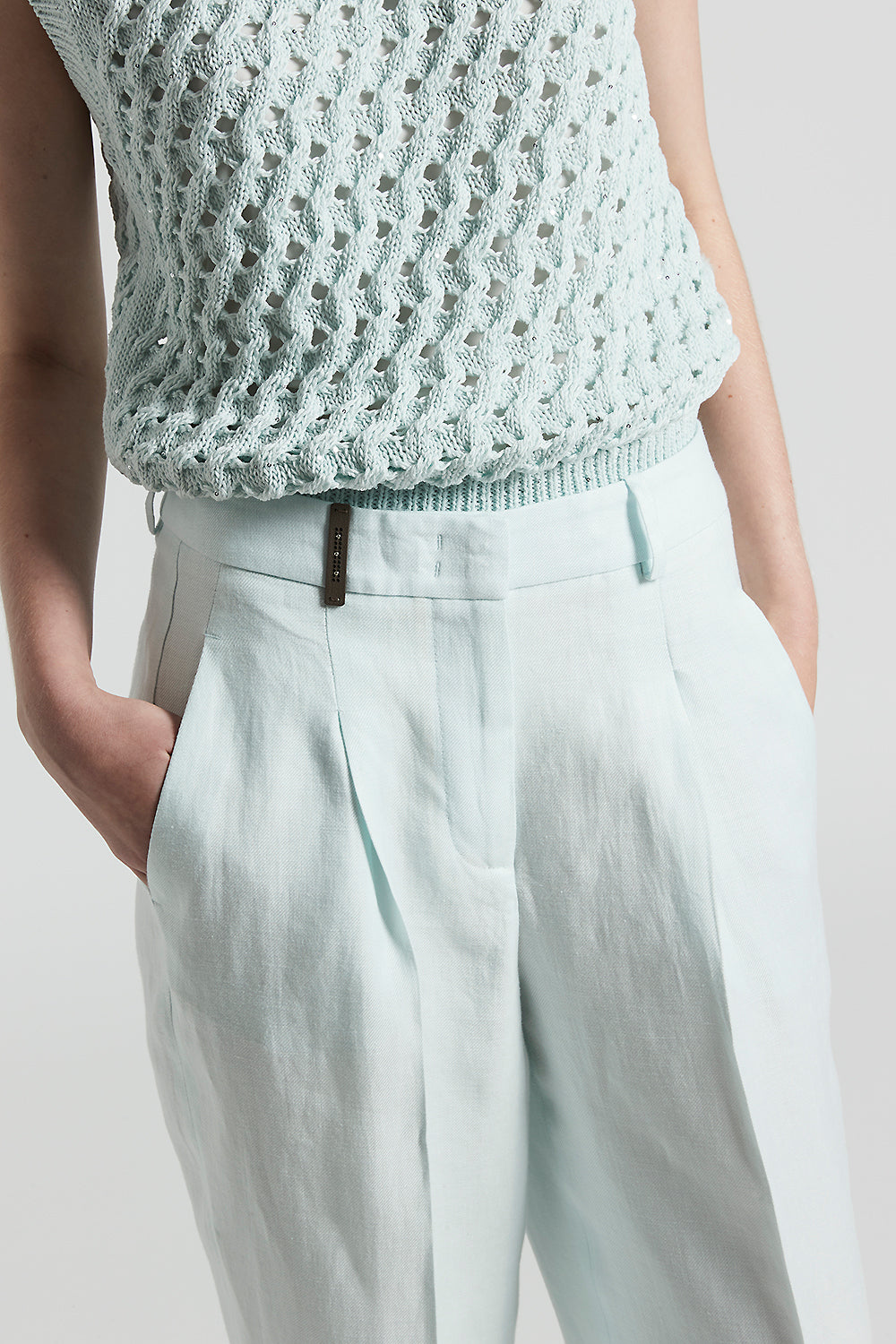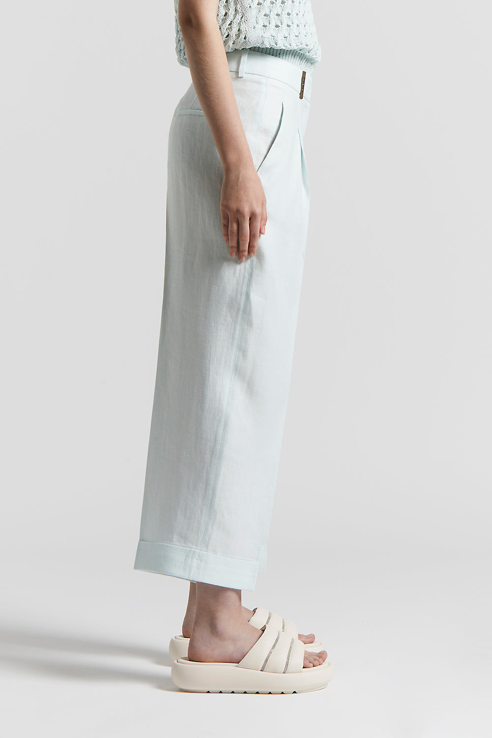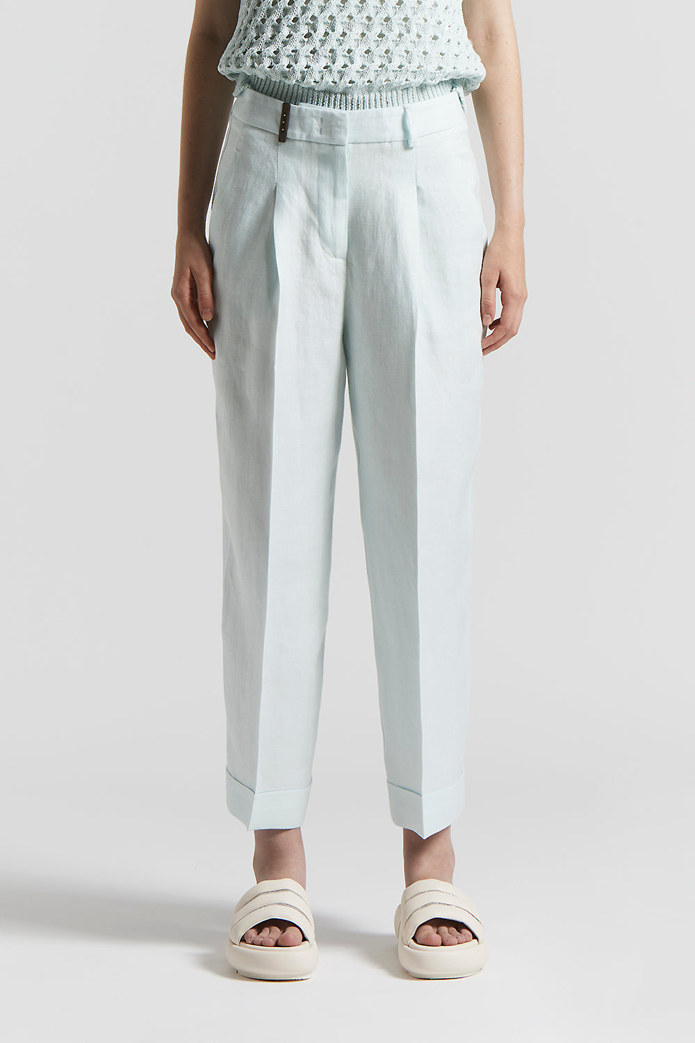 The high waist and turn-up hem define a sleek silhouette, while the impeccable cut and natural fabric ensure a cool, lightweight fit.