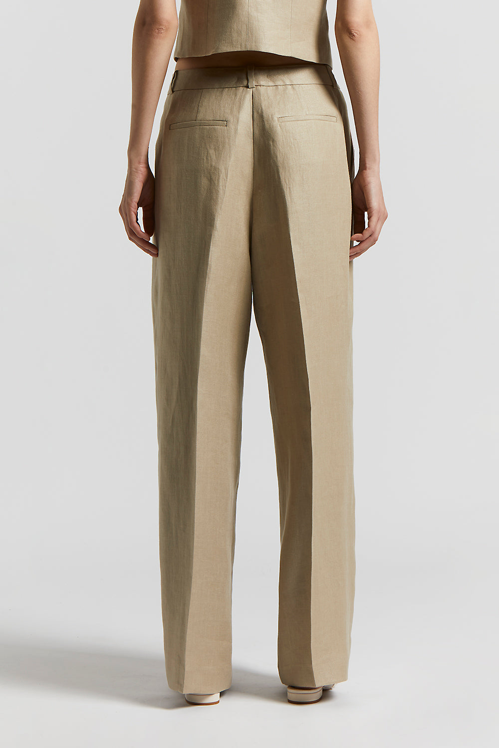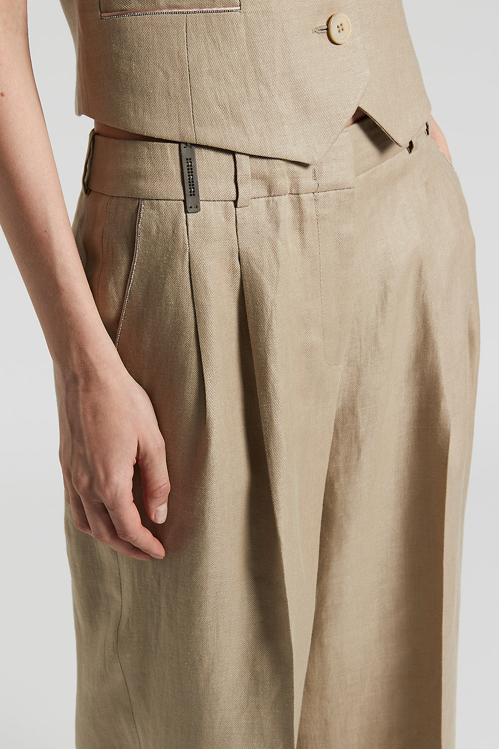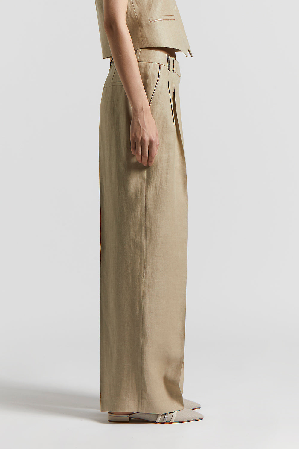 A perfect combination of class and modernity. These trousers with pleats, made of plain-coloured pure linen gabardine, expresses the sophistication of spring and summer.