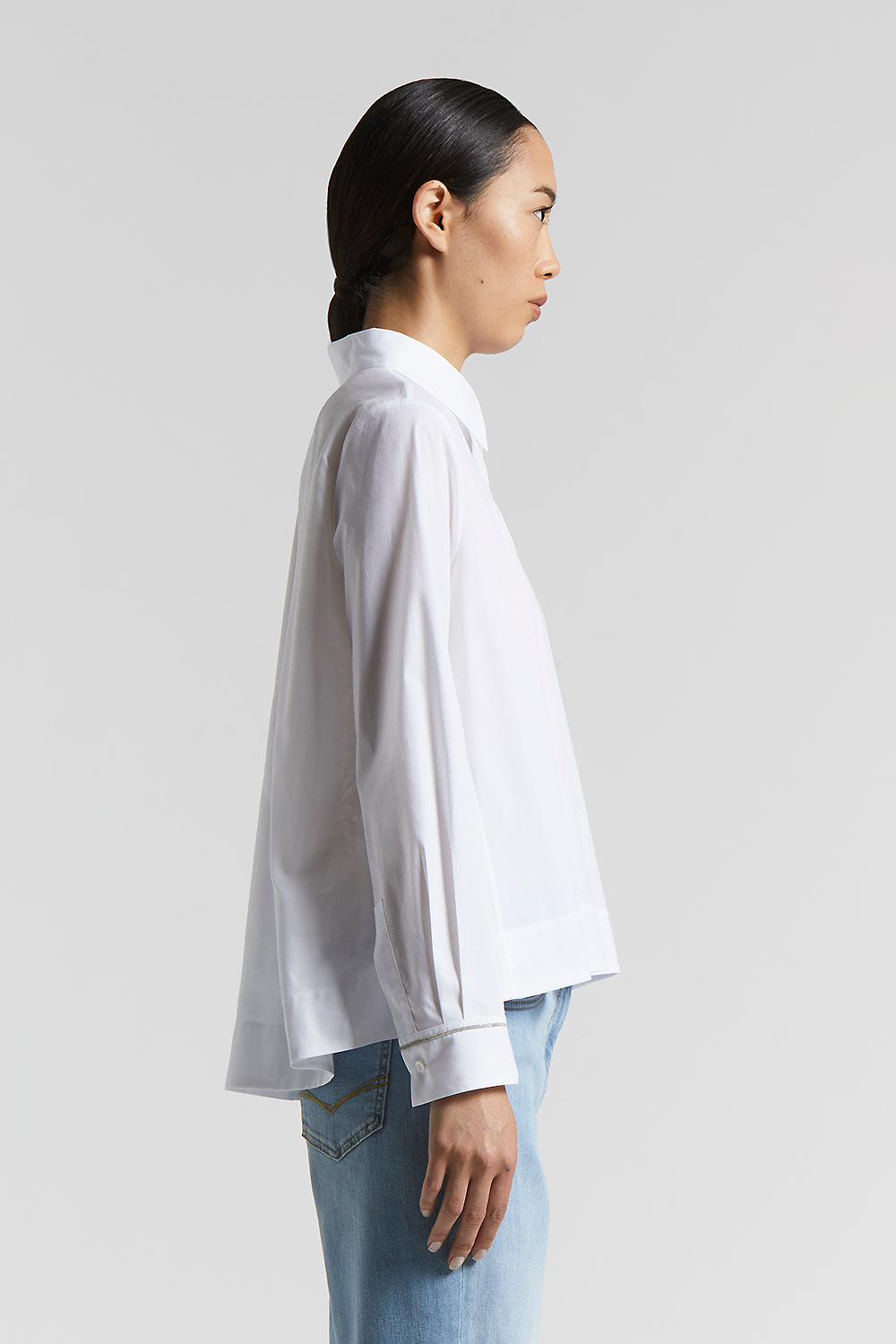 Made of a refined blend of stretch poplin and cotton voile, this shirt combines style and comfort in a feminine and versatile design.