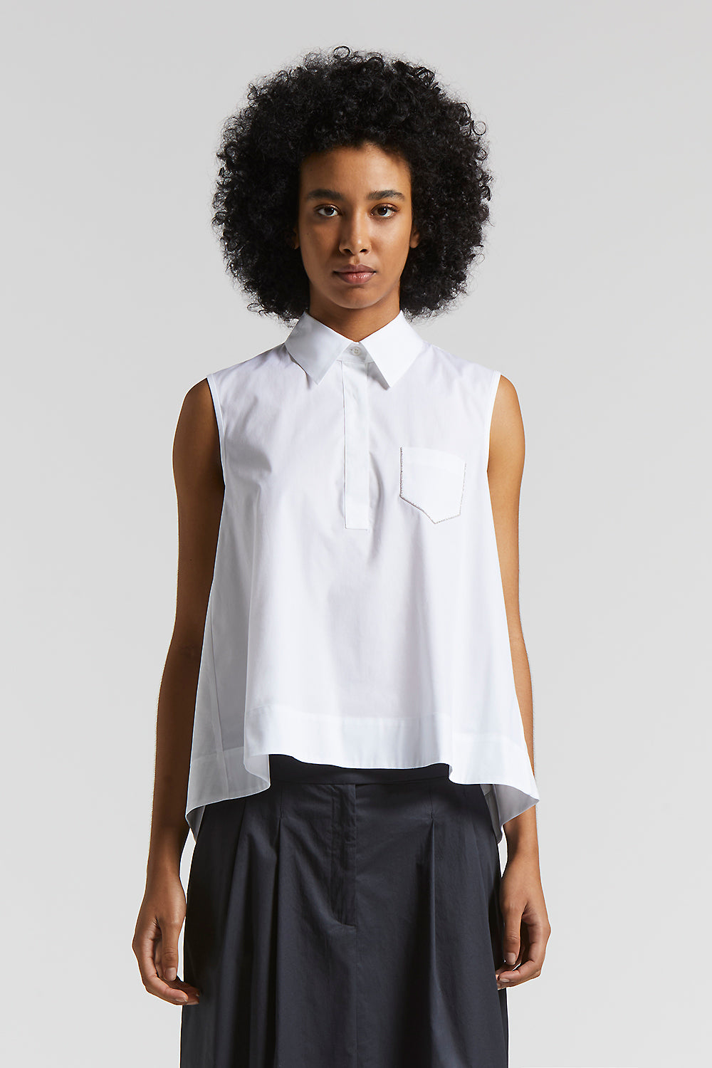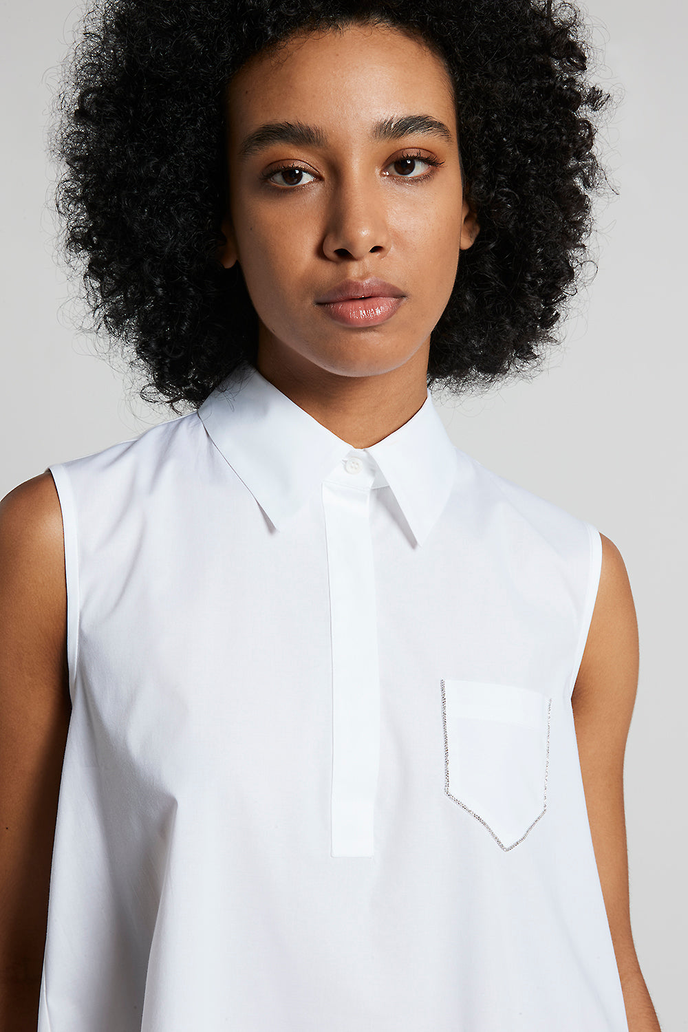 This bi-material shirt in stretch cotton poplin, combined with cotton voile, merges comfort, style and elegance.The Punto Luce detail on the breast patch pocket gives a touch of sparkle, while the ple…