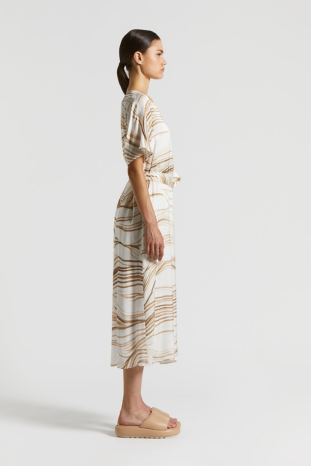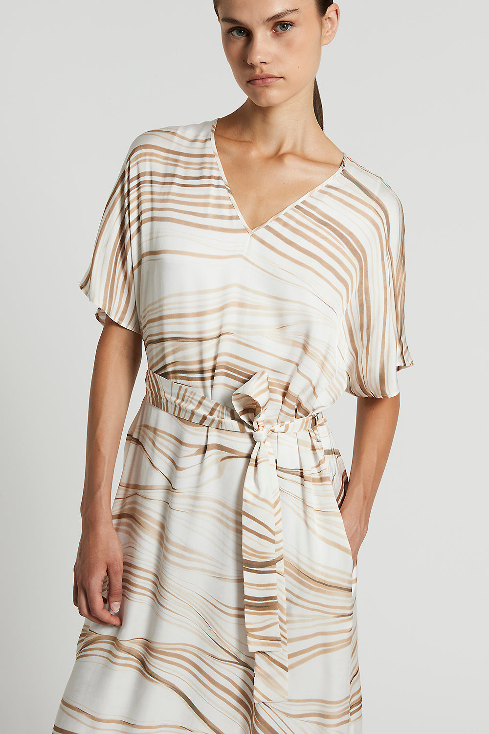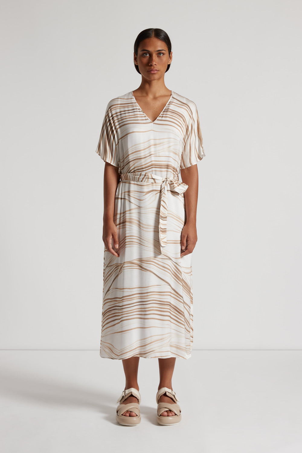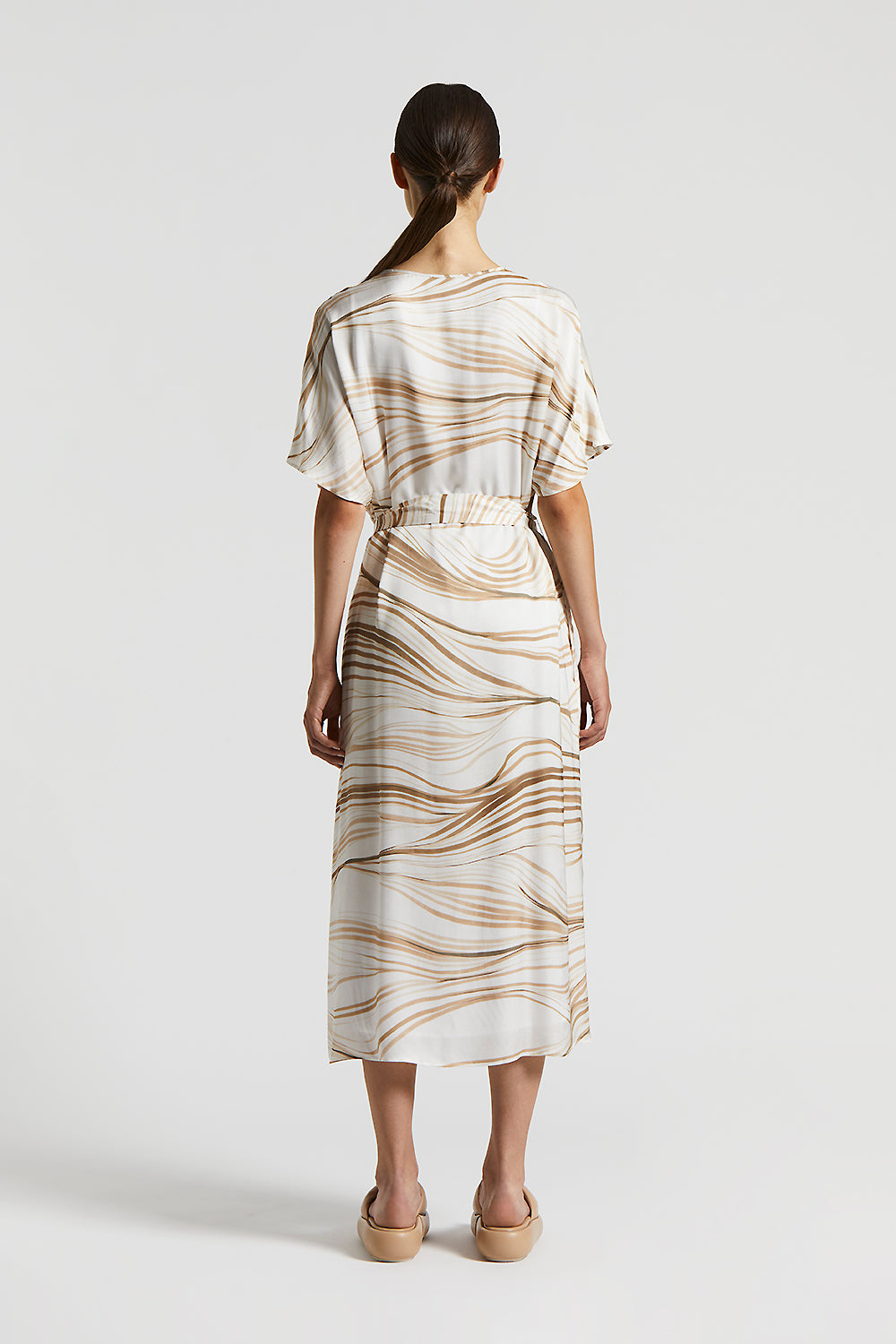 This printed viscose satin kaftan midi dress embodies class and versatility in one. The V-neck discreetly enhances the décolleté.