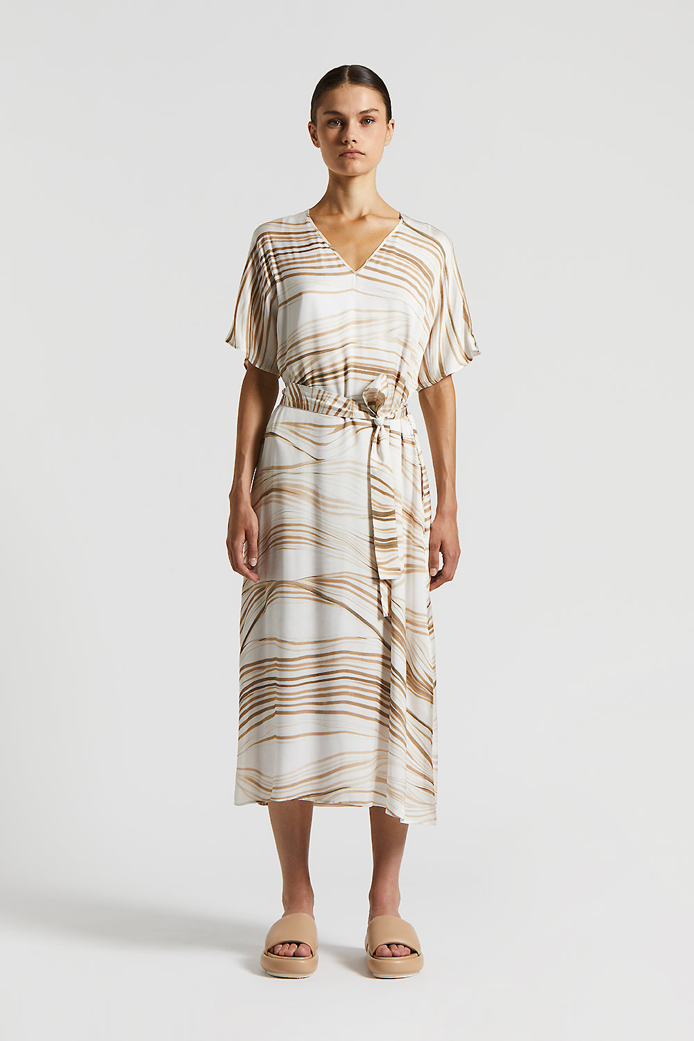 This printed viscose satin kaftan midi dress embodies class and versatility in one. The V-neck discreetly enhances the décolleté.The kimono sleeves give a modern look and a loose fit, making this garm…