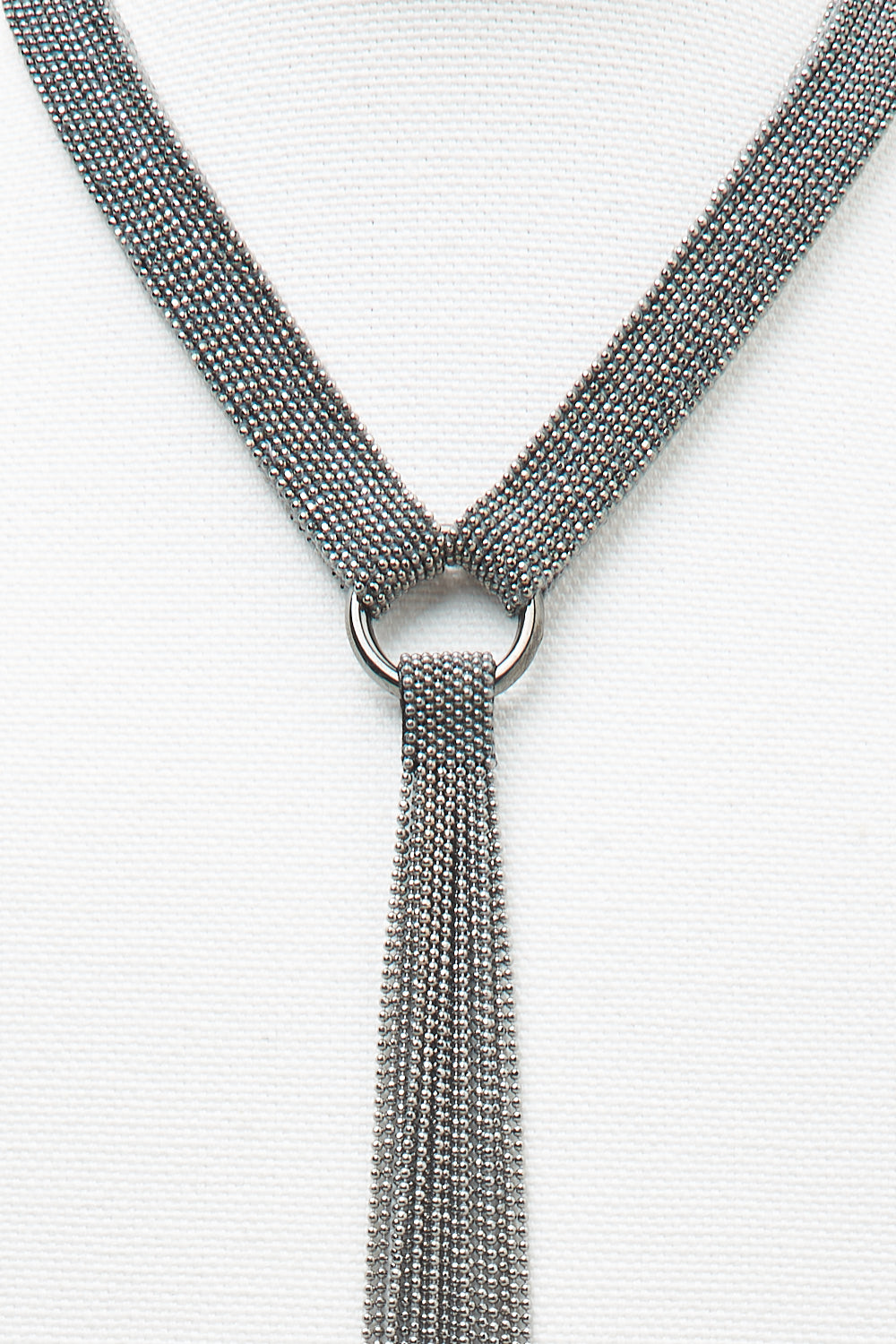 A symphony of light and movement. This sliding knot “tie” necklace illuminates the décolleté with its sleek, sophisticated design, embellished with a central fringe that captures the light at every st…