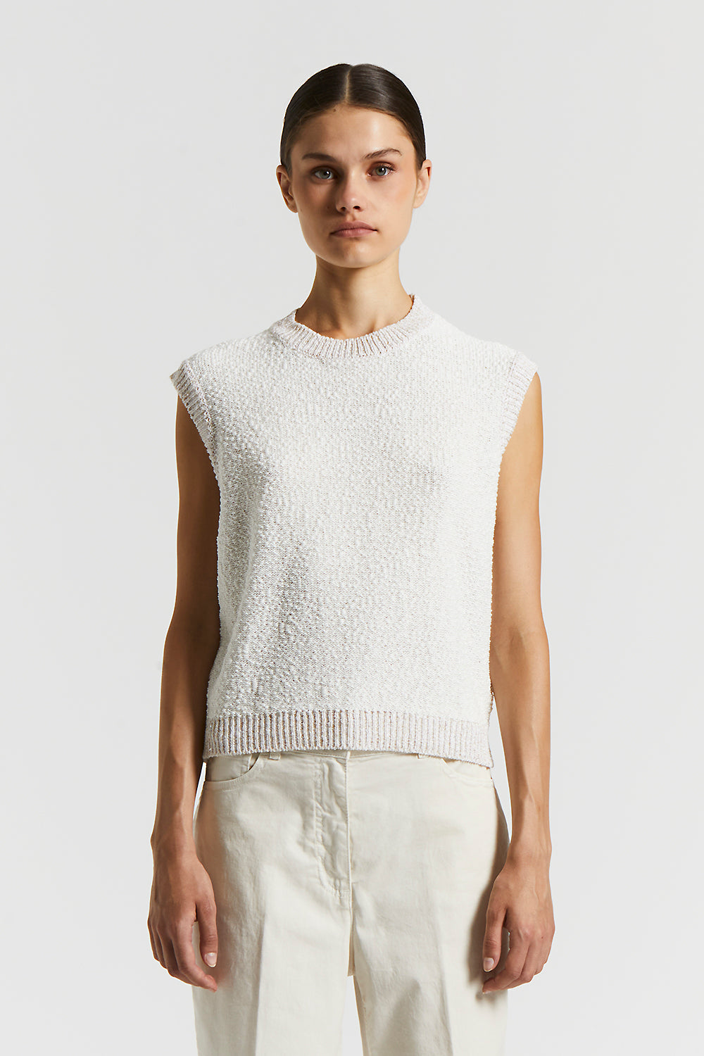 A top featuring unique details and elegance in pure cotton nubby ribbon embellished with cotton blend moulinè yarn trims with sequins that catch the light.Purl stitch with a nubby effect gives this to…