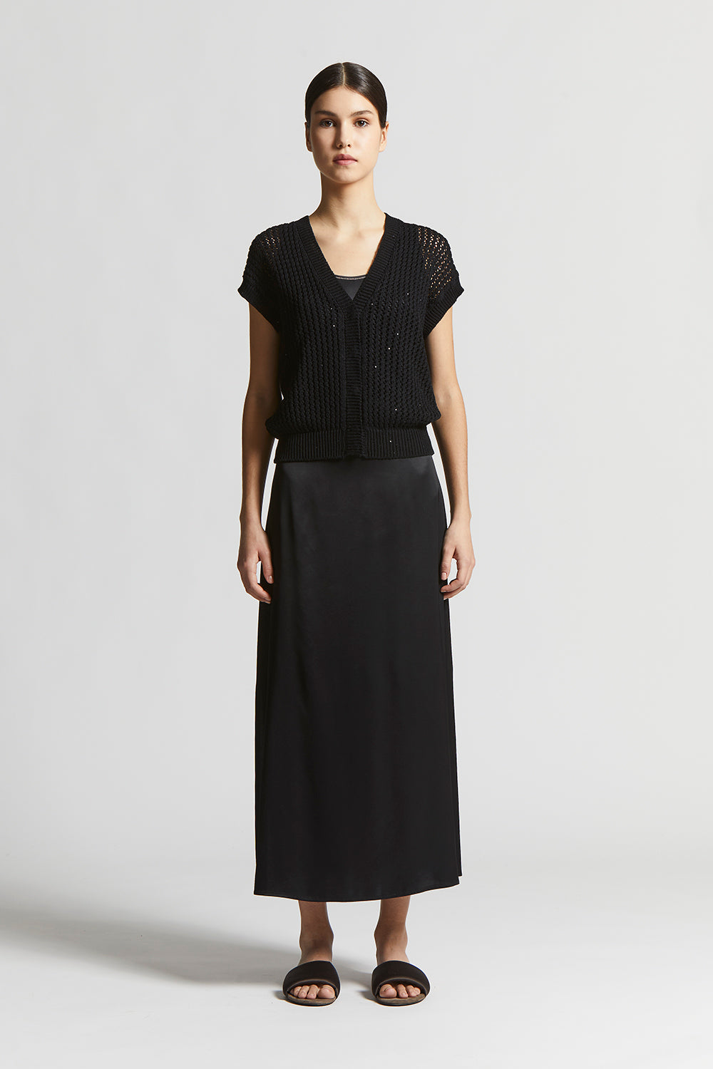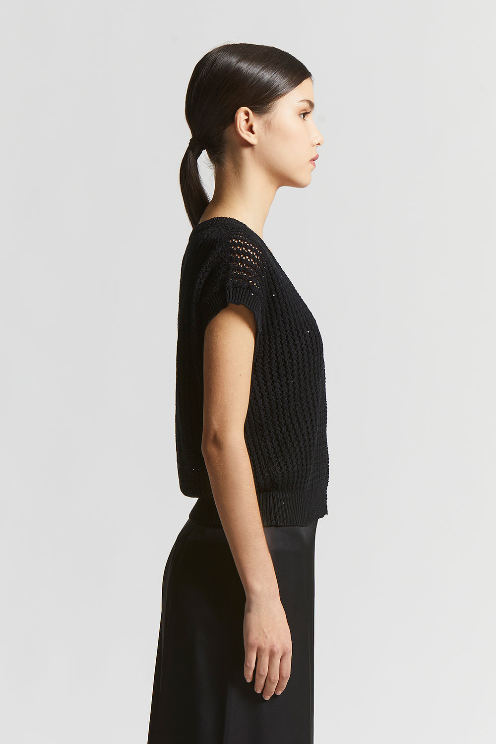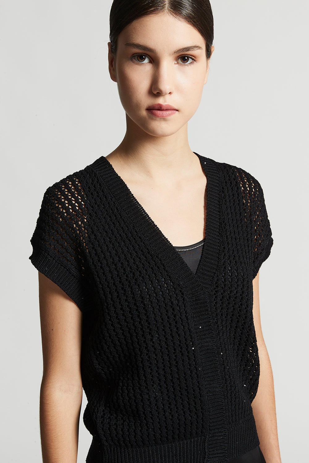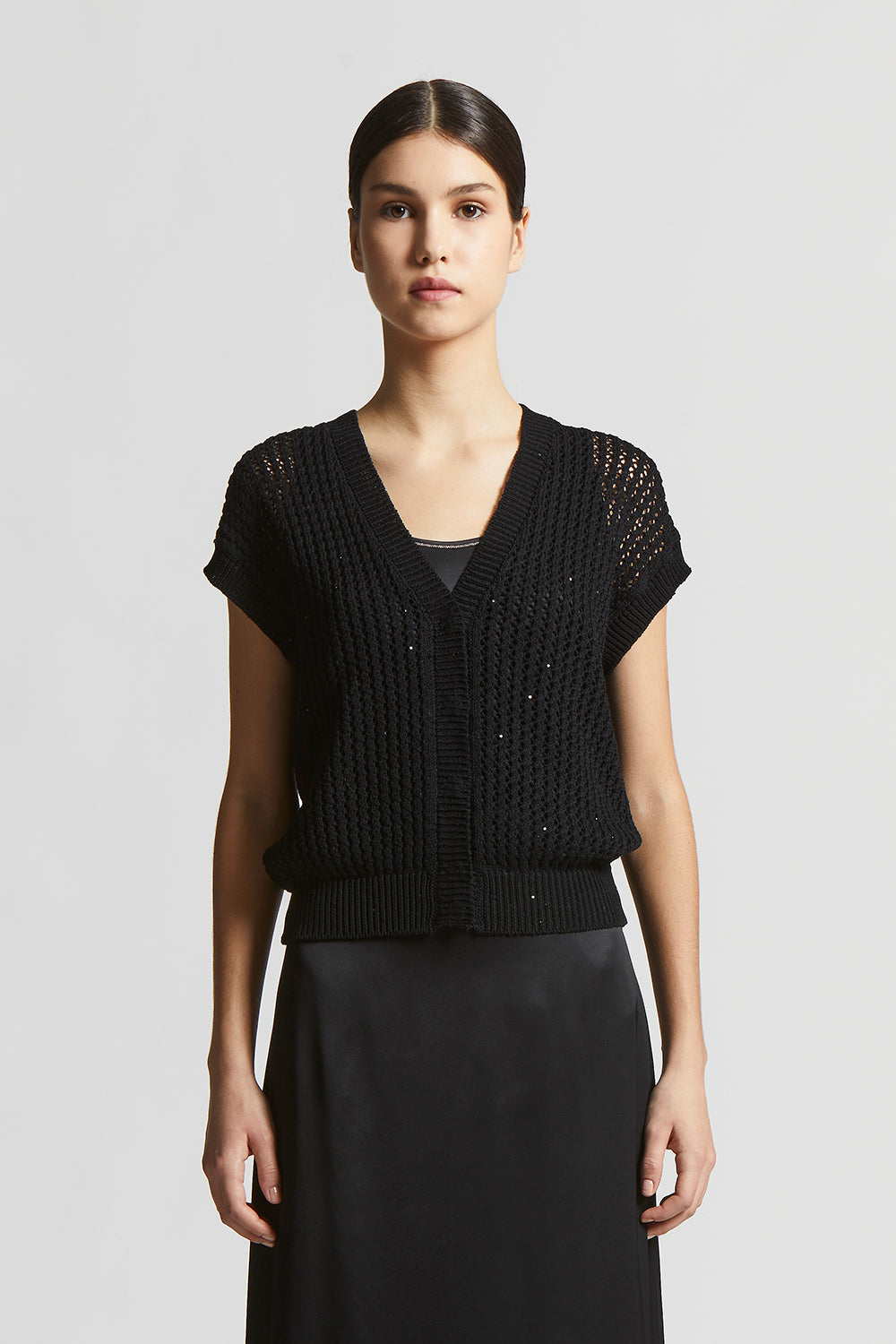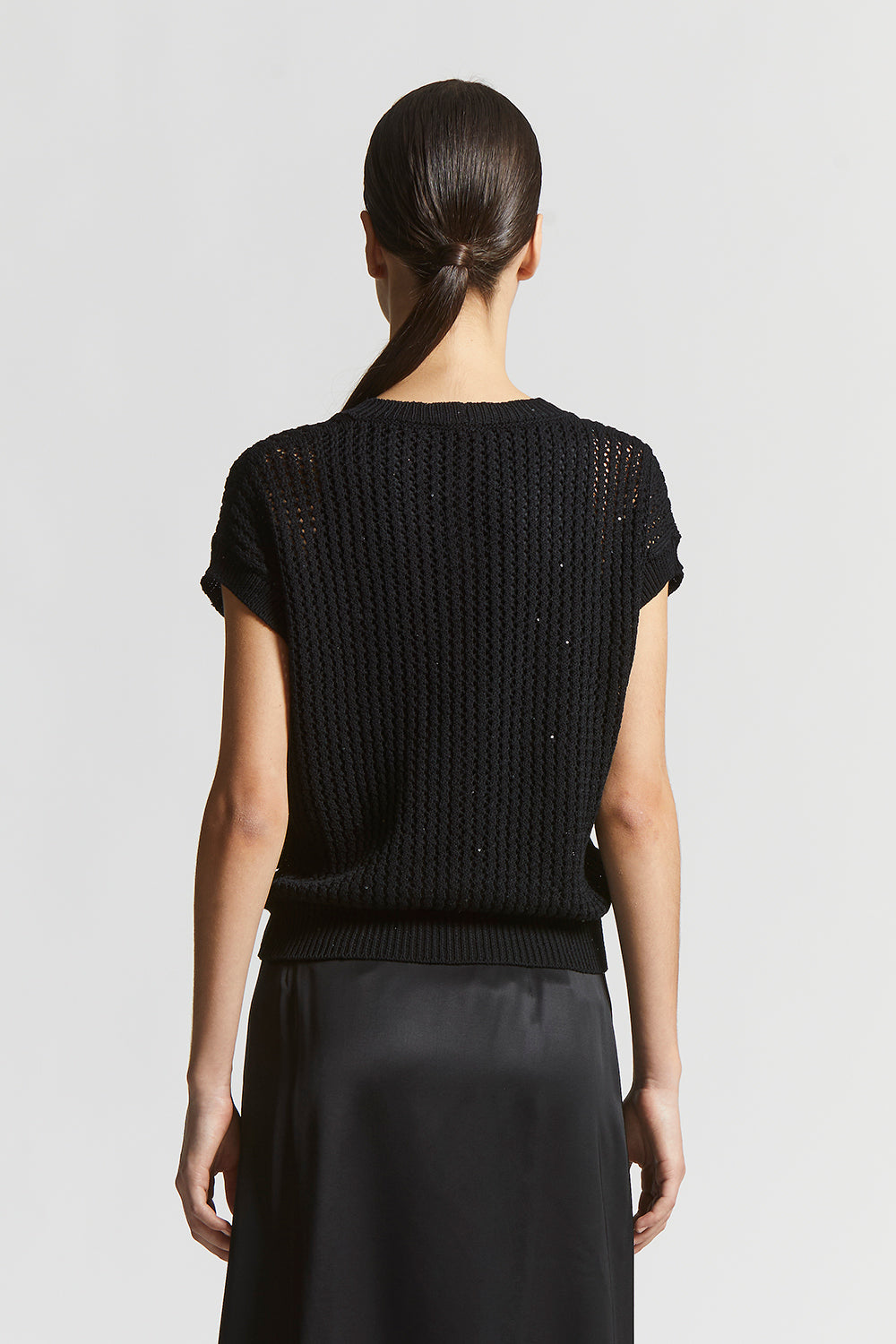 The perforated rib knit, embellished with delicate micro sequins, creates a bright sophisticated effect designed to enhance even the simplest outfit with a special touch.
