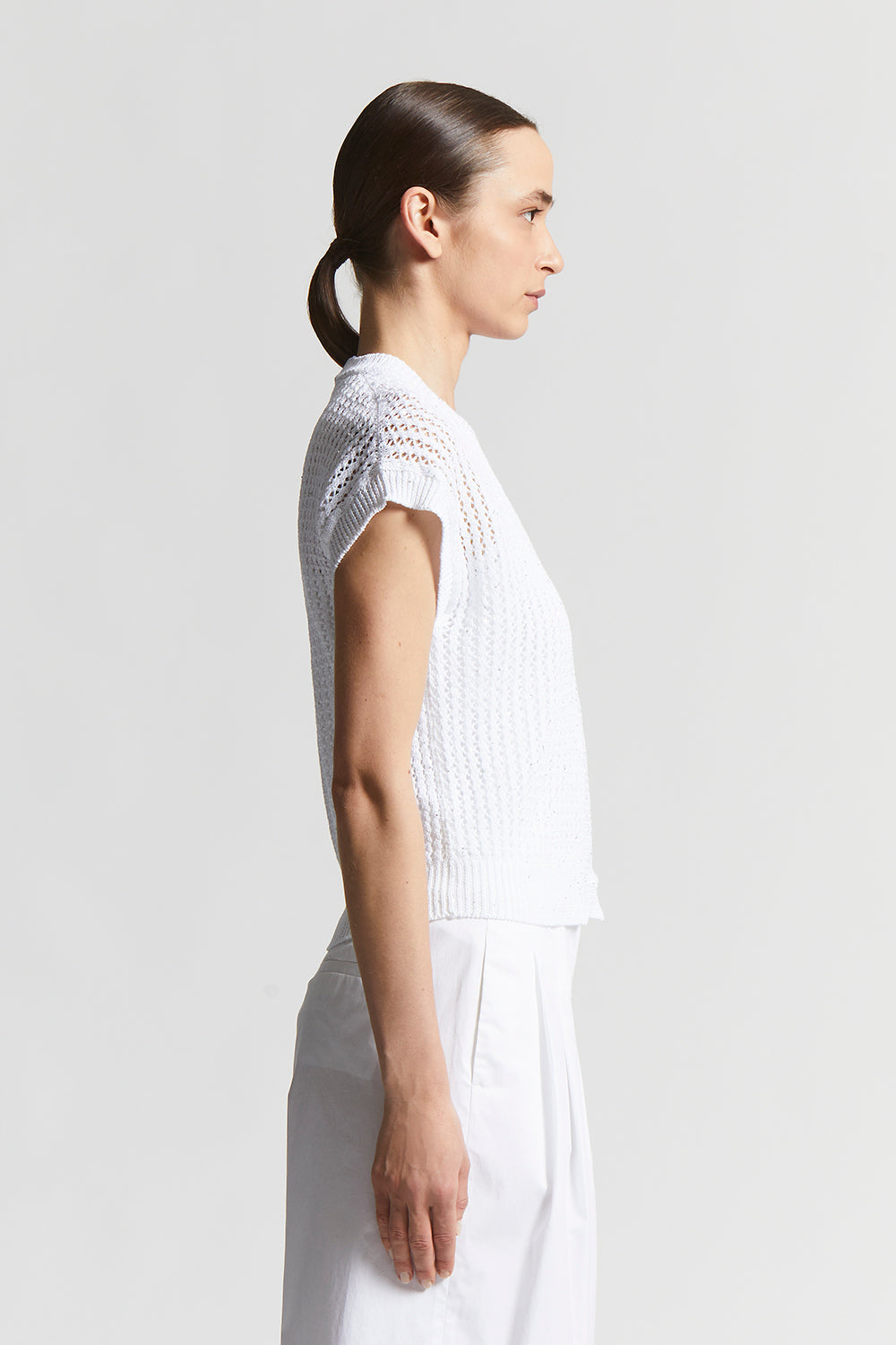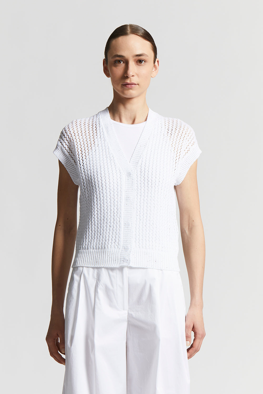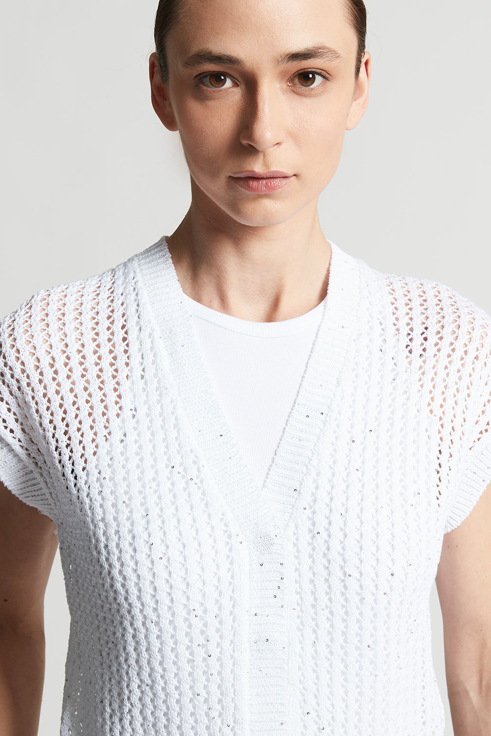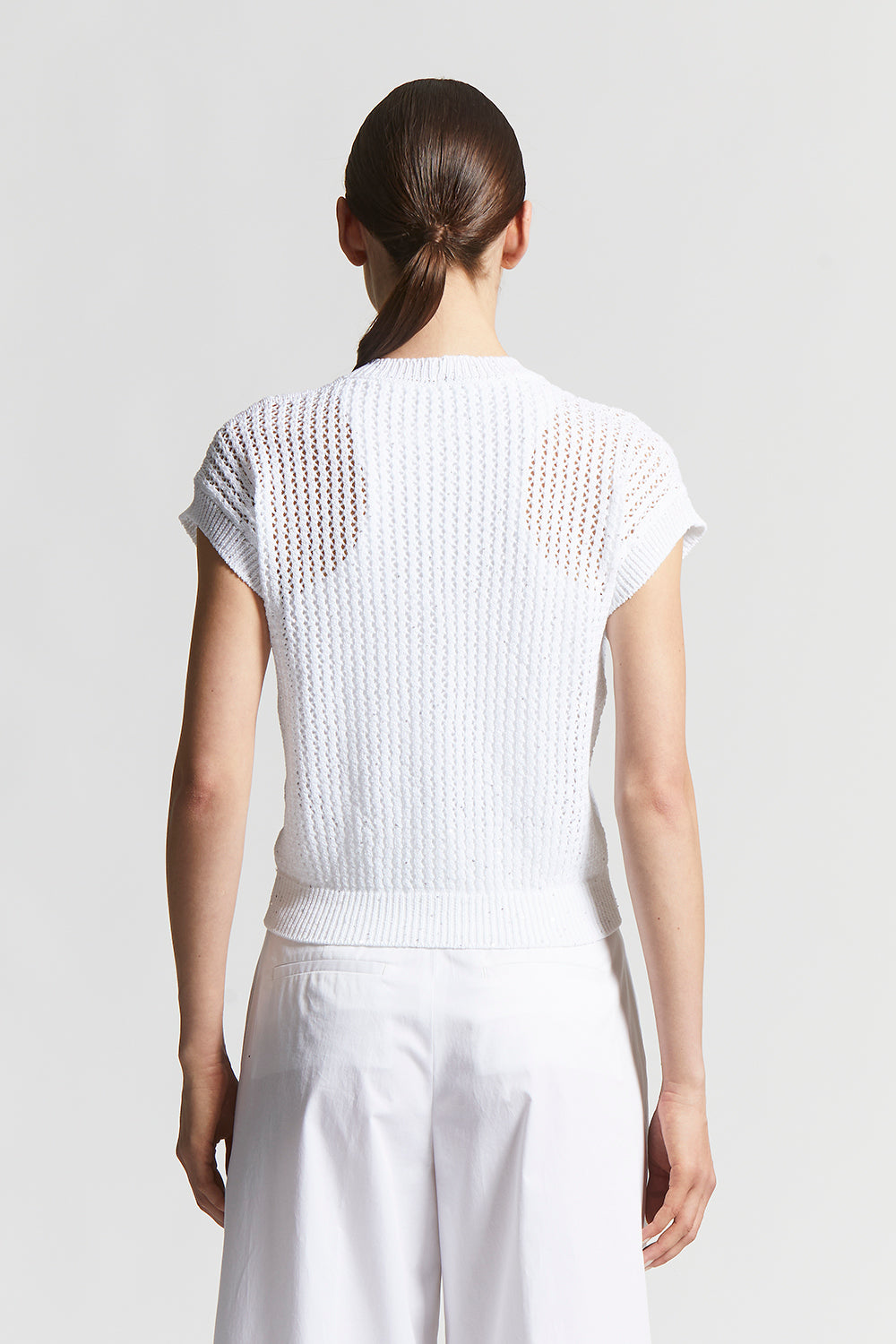 The perforated rib knit, embellished with delicate micro sequins, creates a bright sophisticated effect designed to enhance even the simplest outfit with a special touch.