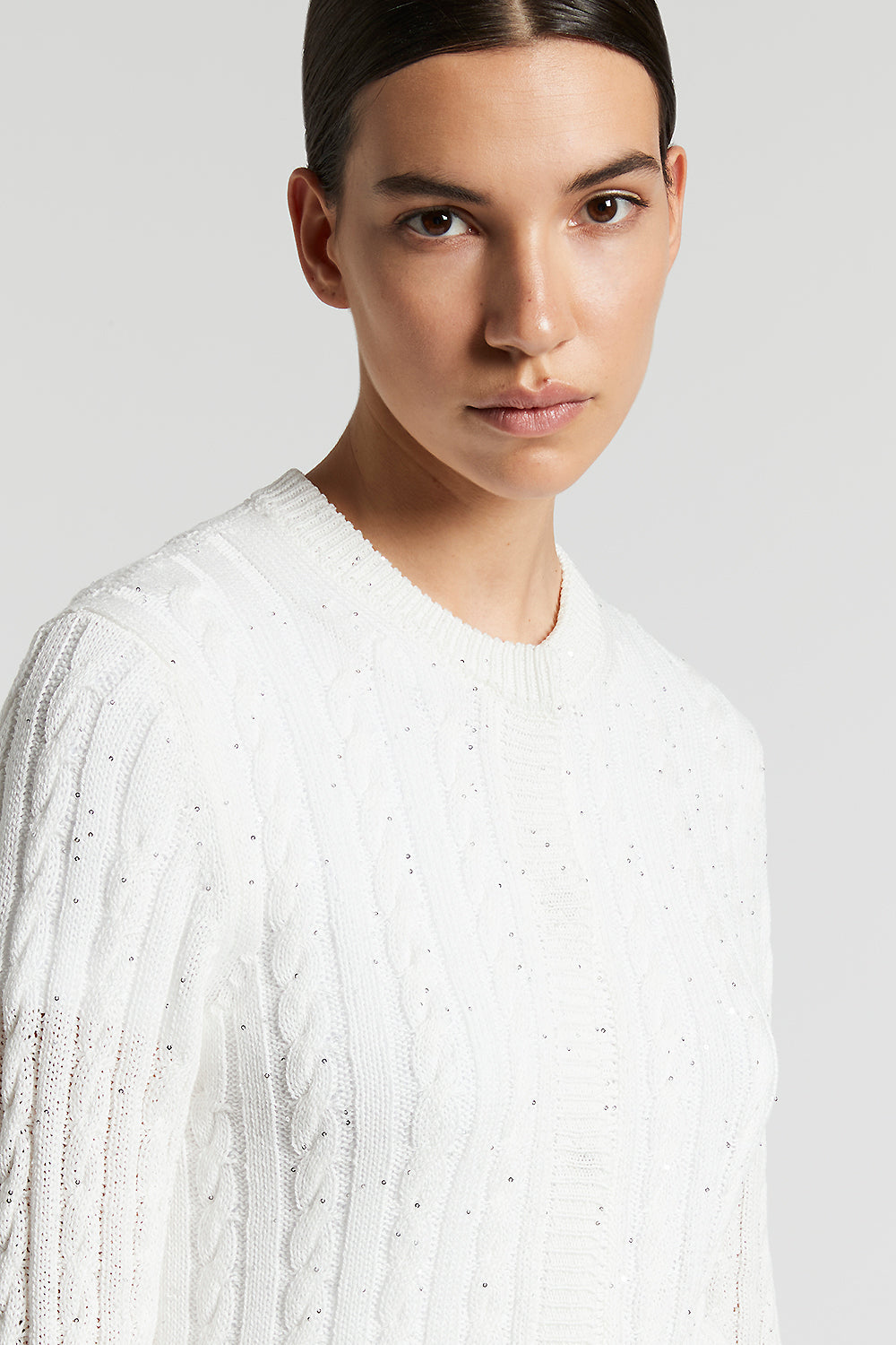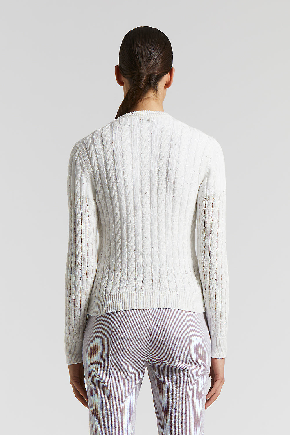 The ribbed knit with a cable motif adds elegance, while delicate micro sequins embellish the garment, enhancing every movement with a sparkle.