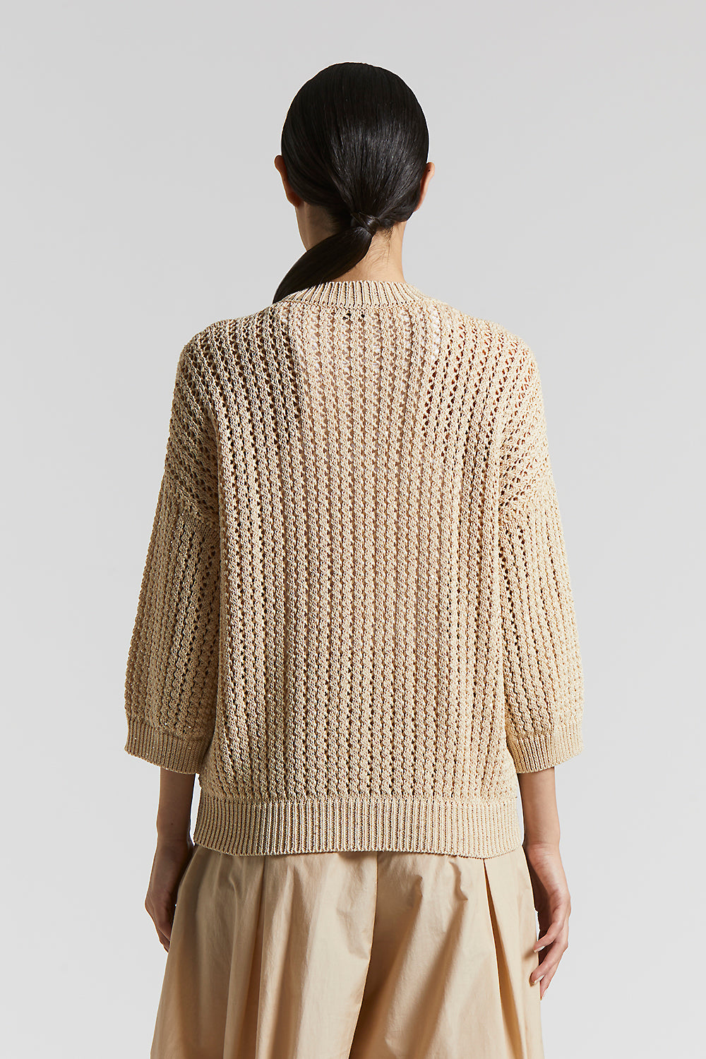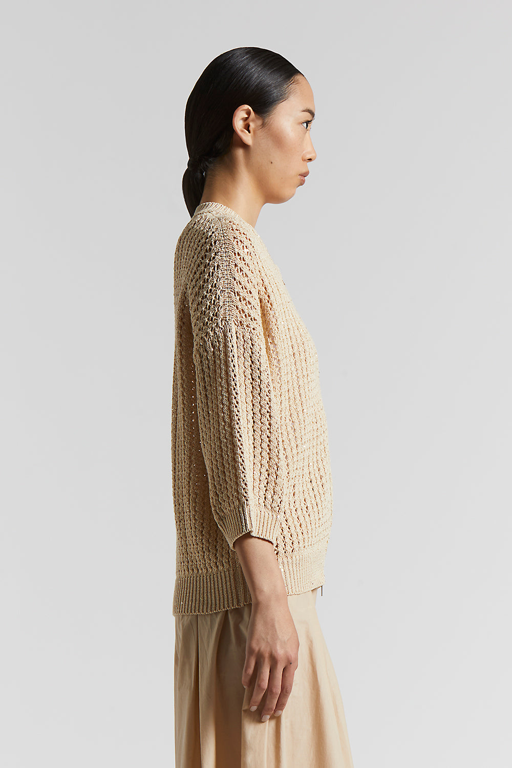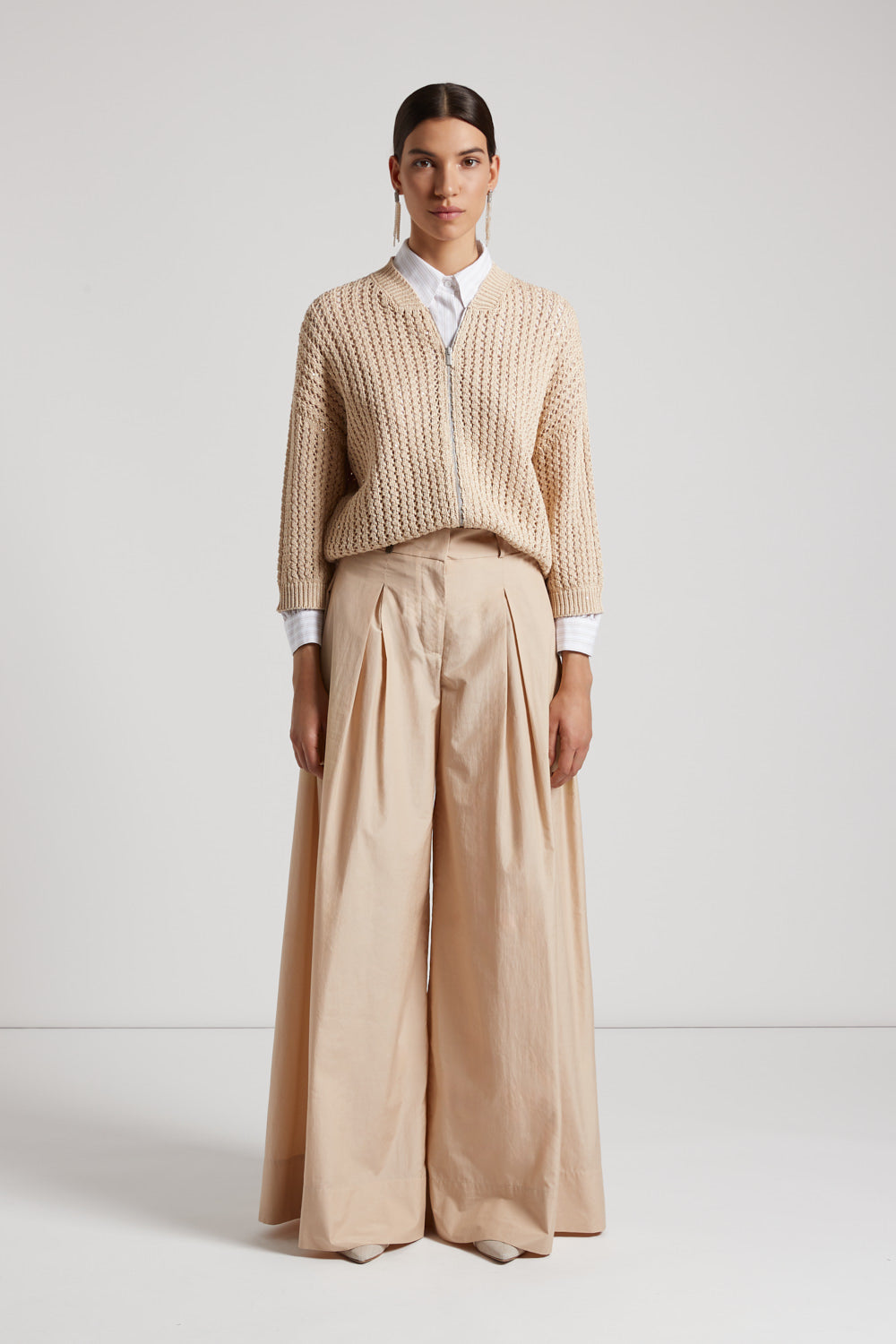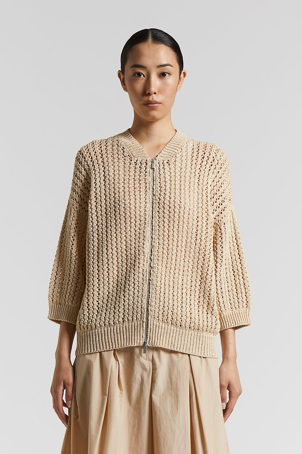 With modern and sporty chic aesthetics, this pure cotton cordonnet bomber jacket features a perforated rib knit that is ideal for spring.Delicate micro sequins embellish the garment, while the oversiz…