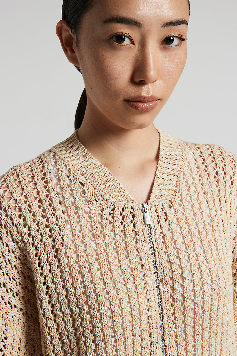 Peserico – Pure cotton cordonnet bomber jacket with sequins – Amber beige