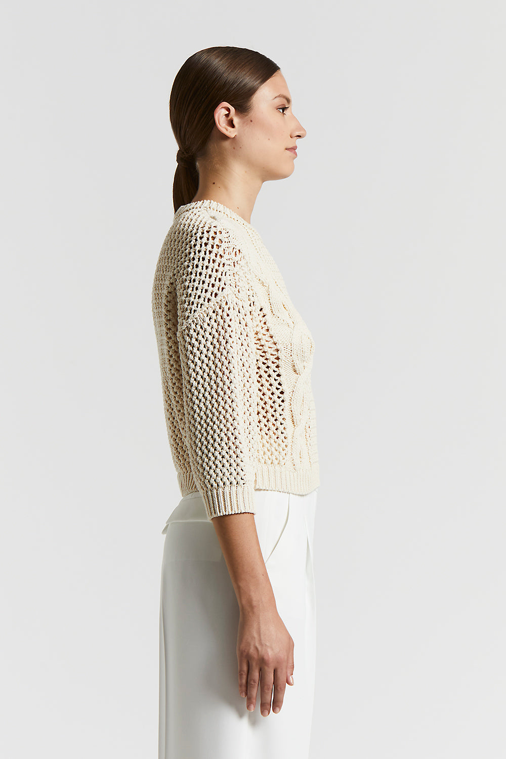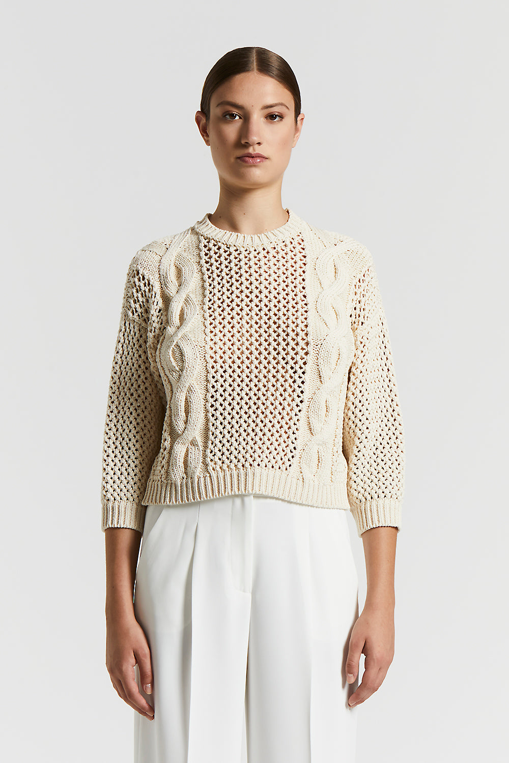 Made of pure cotton ribbon, this crew neck sweater stands out for its special openwork stitch embellished with elegant cable inserts.