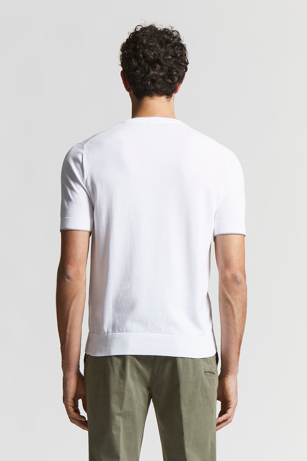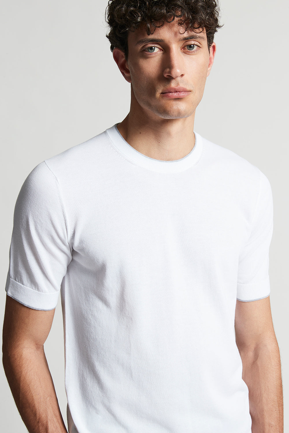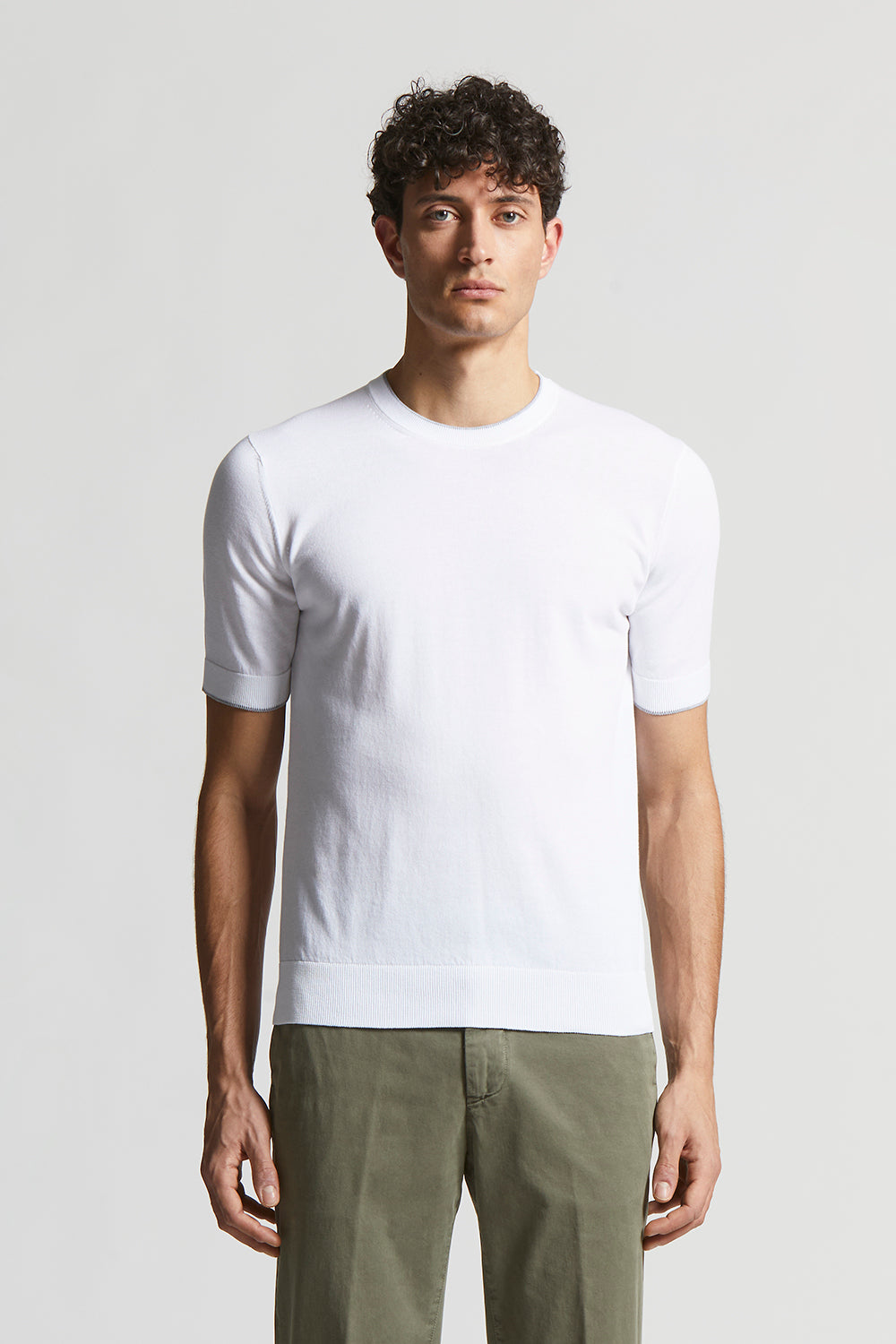 T-shirt in fine pure cotton yarn knitted in stocking stitch to ensure comfort and freshness.The crewneck and ribbed neck, cuffs and hem make it perfect to wear alone or under a jacket for discreet ele…