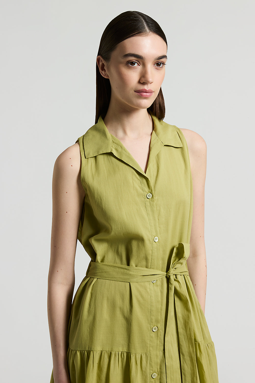 Made of lightweight pure cotton voile, this long dress is characterised by its understated elegance. The sleeveless design with collar lends a fresh touch.