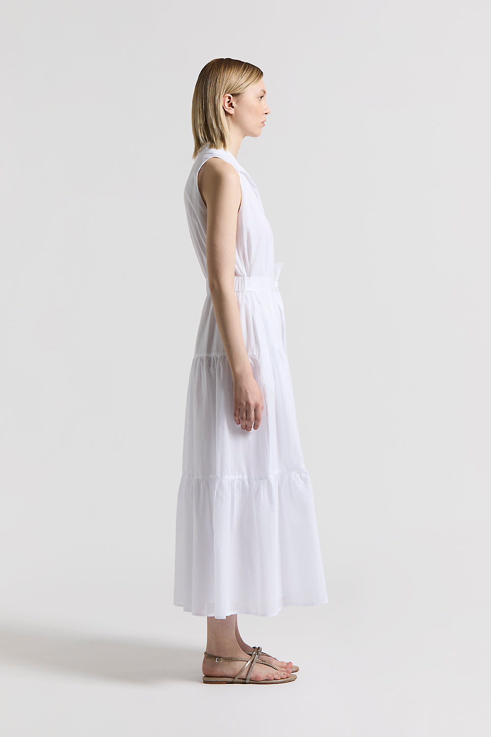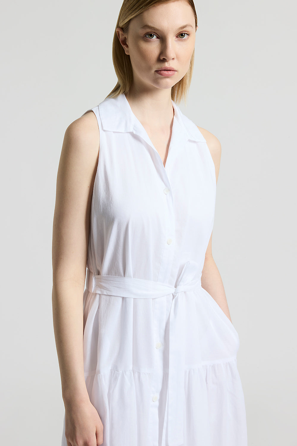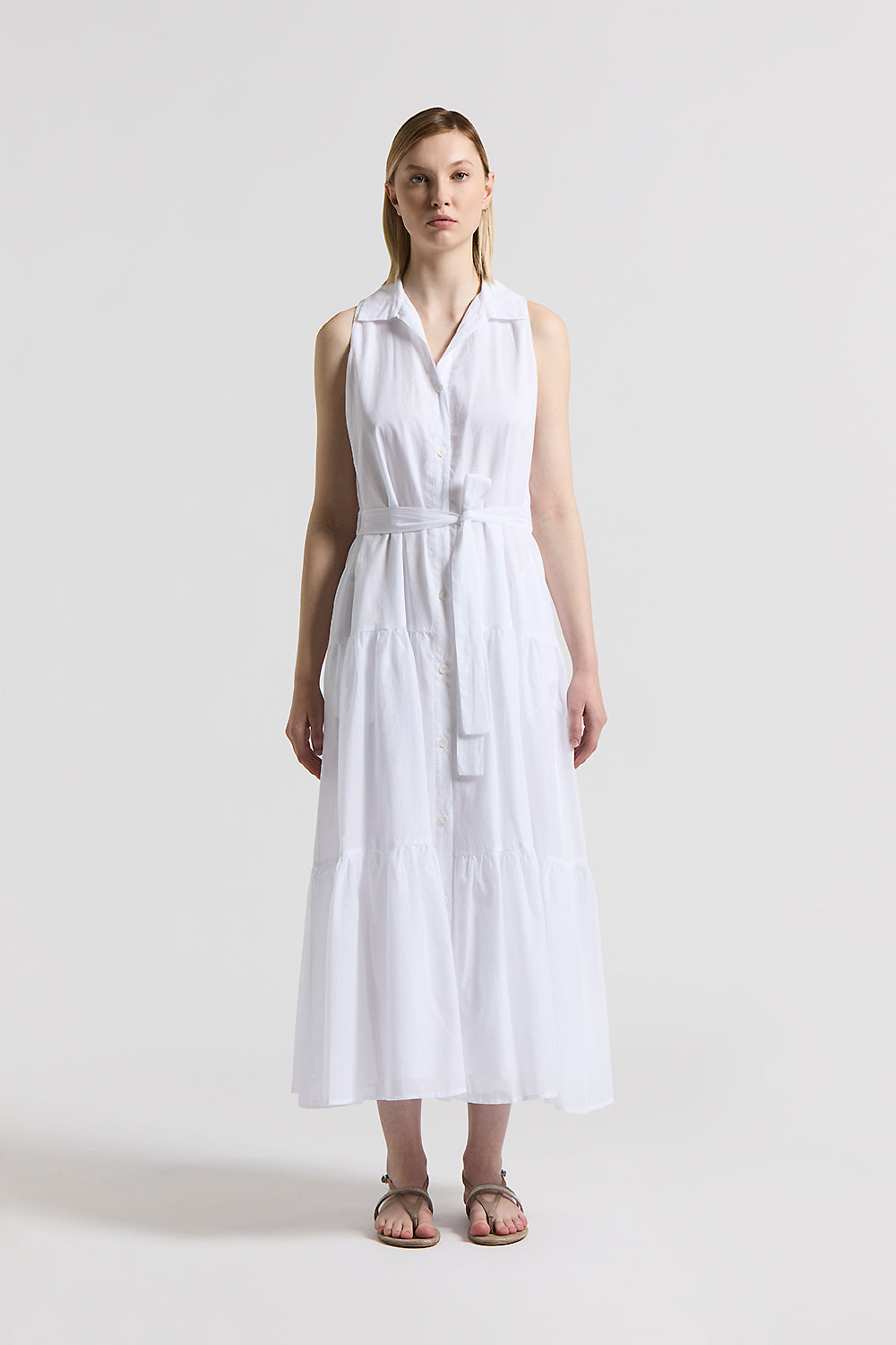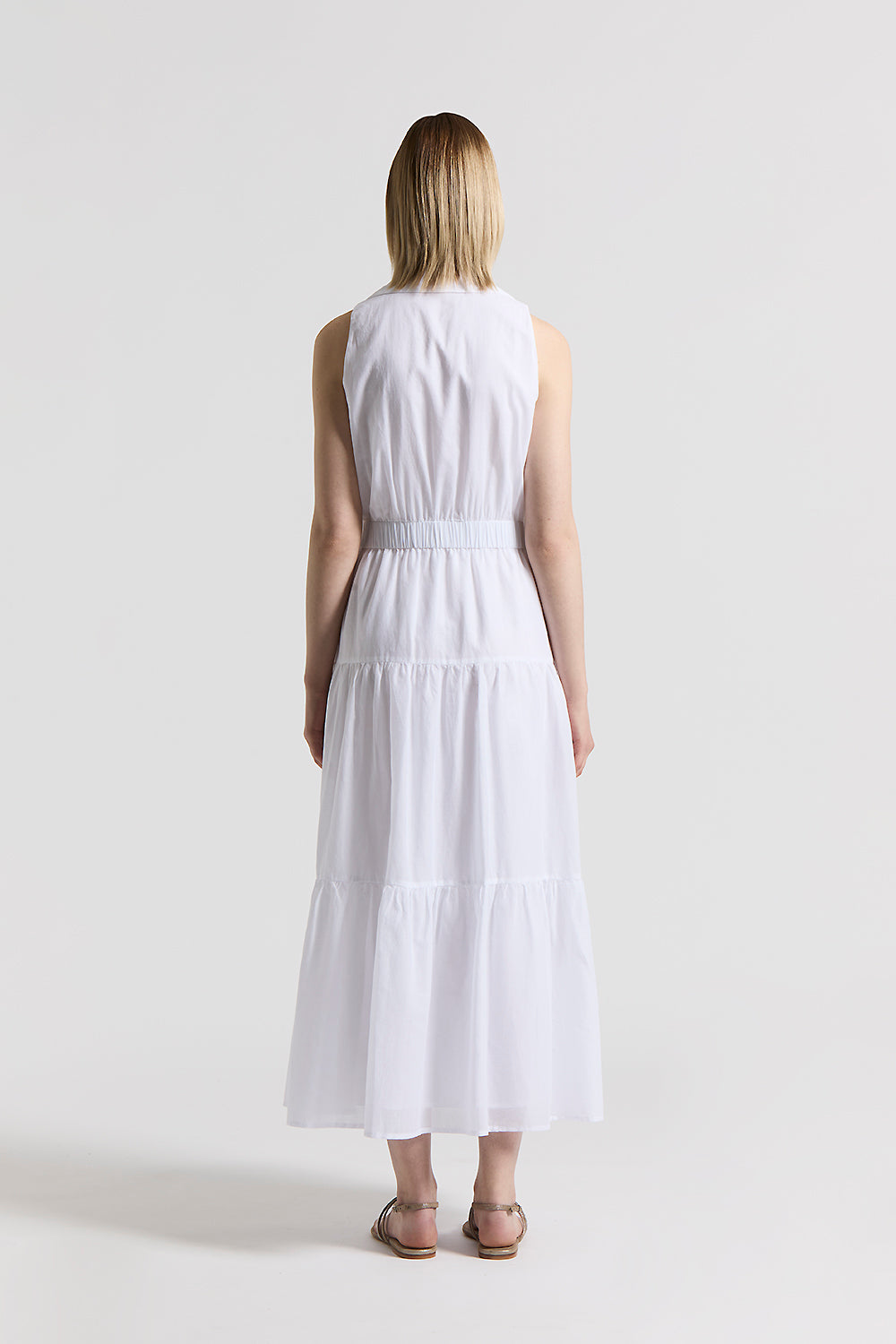 Made of lightweight pure cotton voile, this long dress is characterised by its understated elegance. The sleeveless design with collar lends a fresh touch.