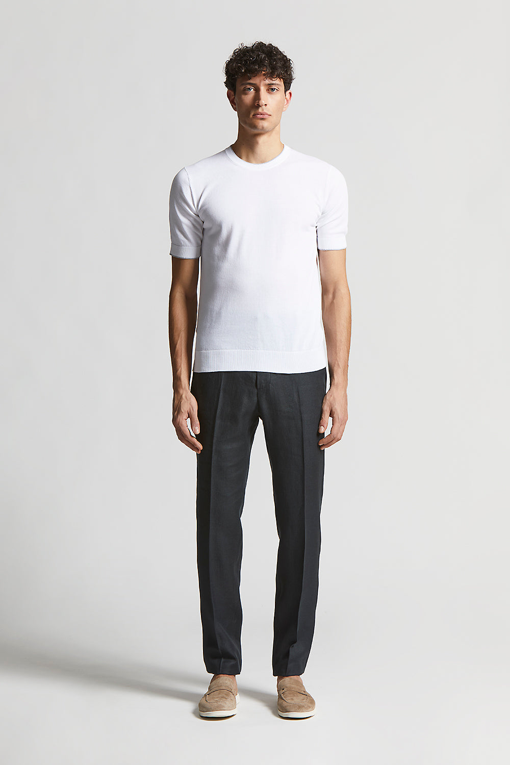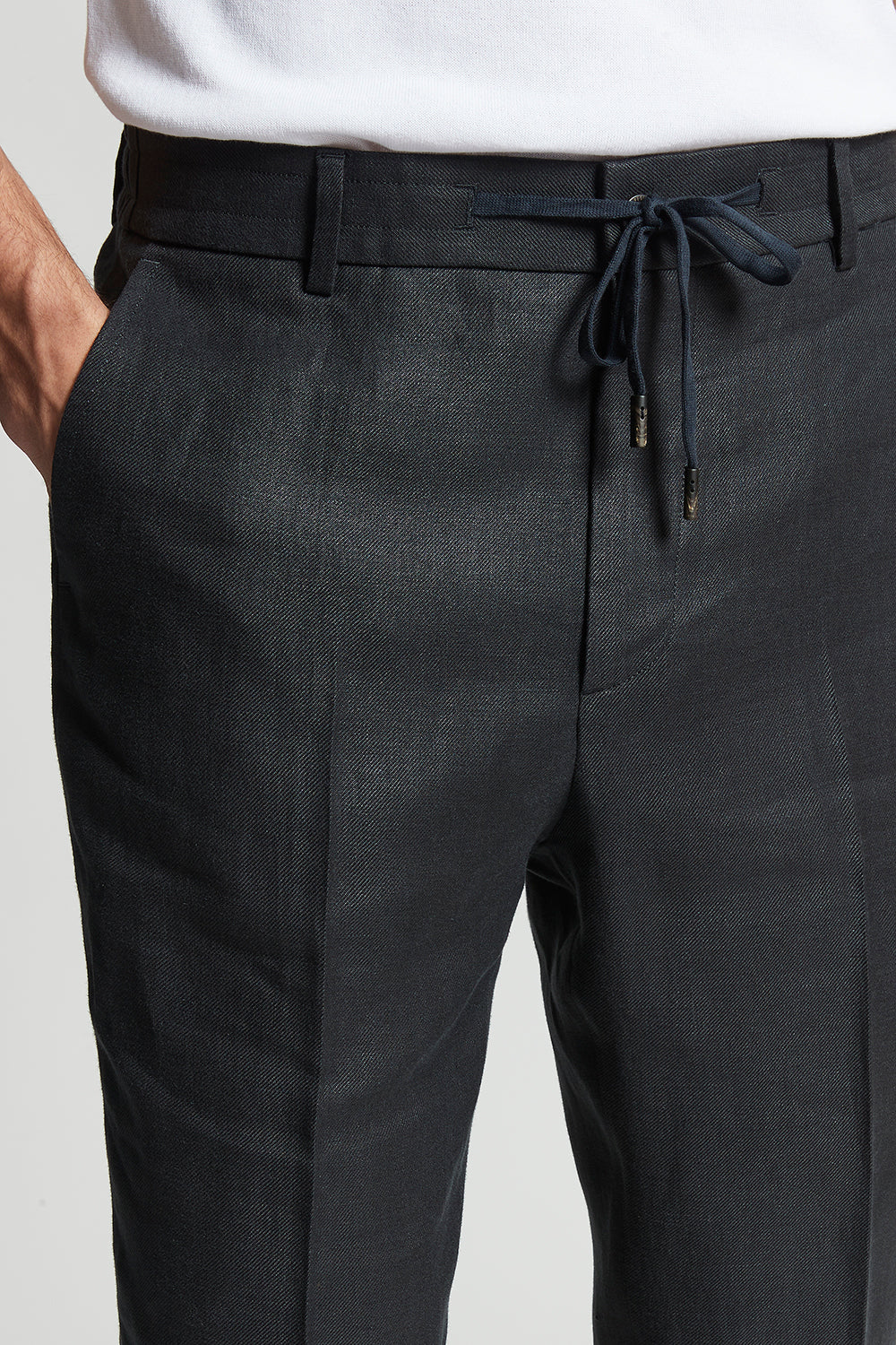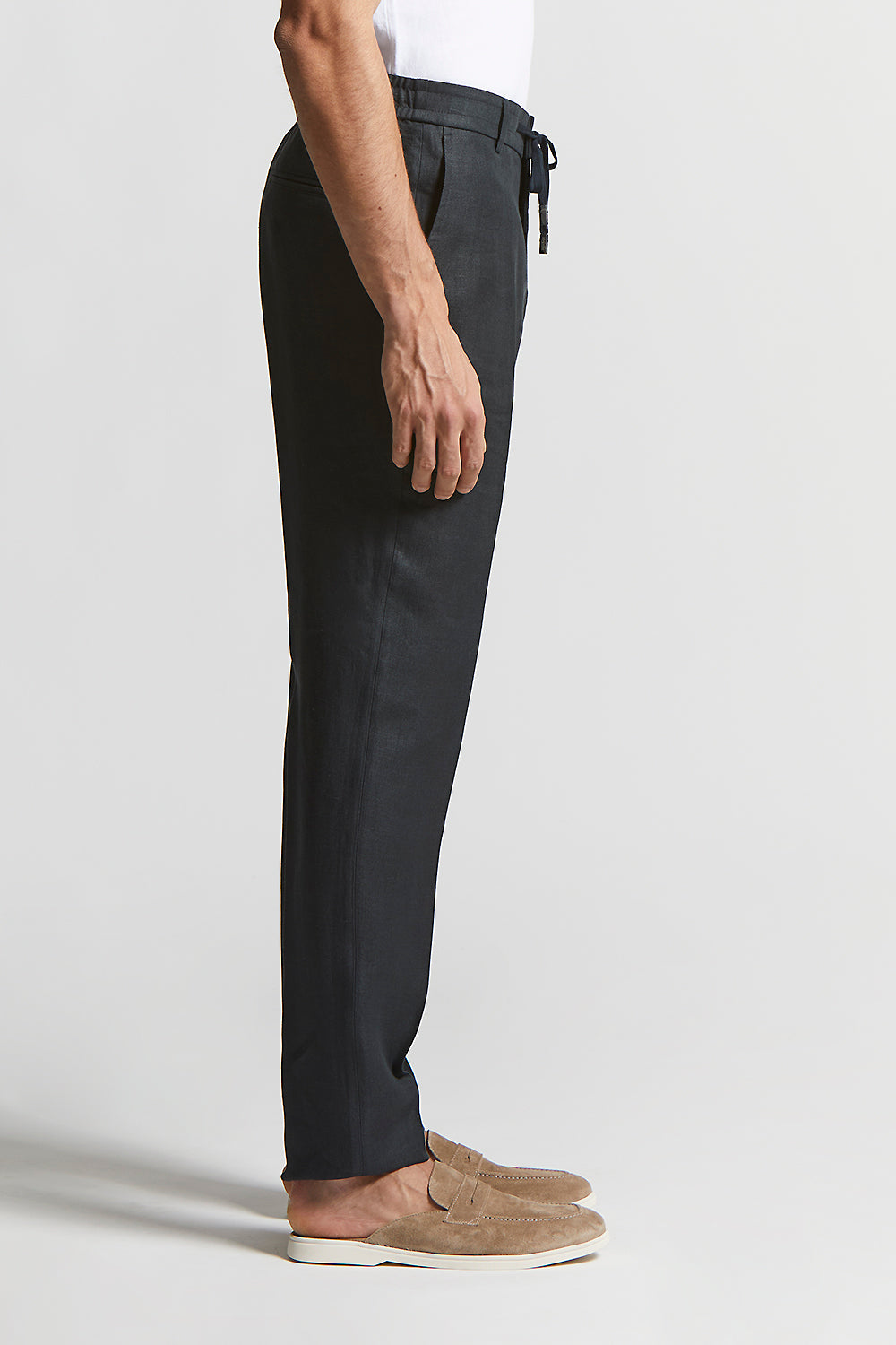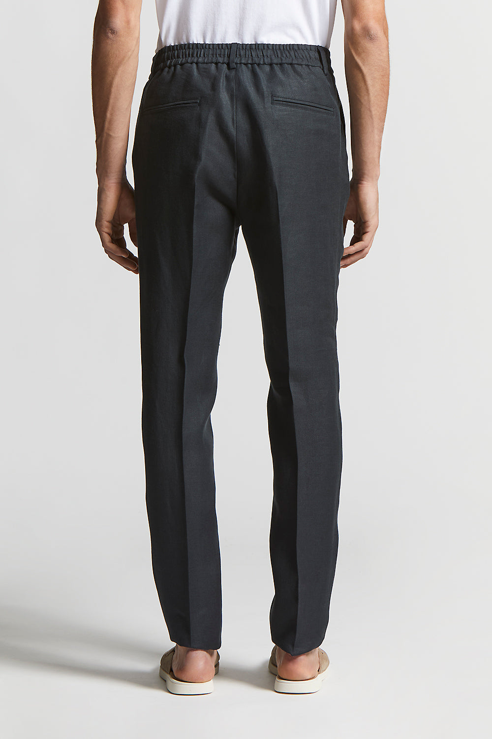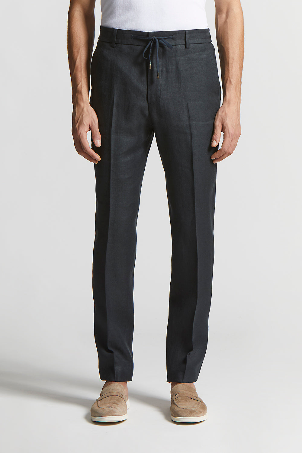 Elegance and comfort converge in these jogger trousers made of high quality pure linen gabardine. The elasticated waistband with drawstring ensures a perfect fit.