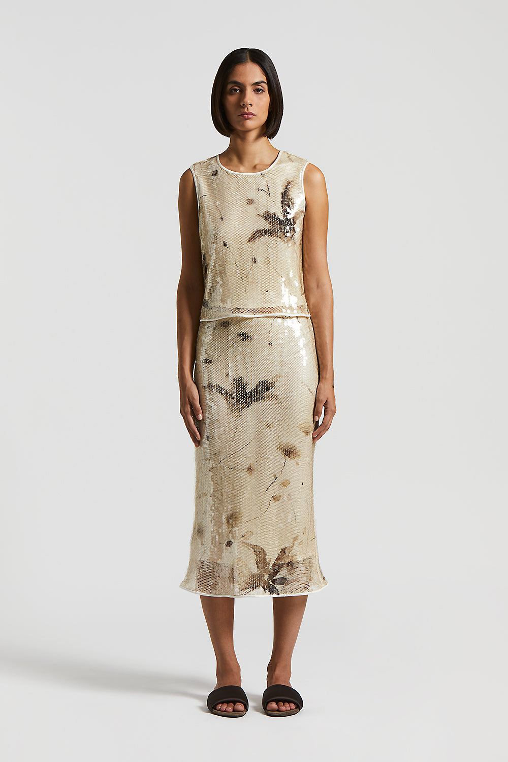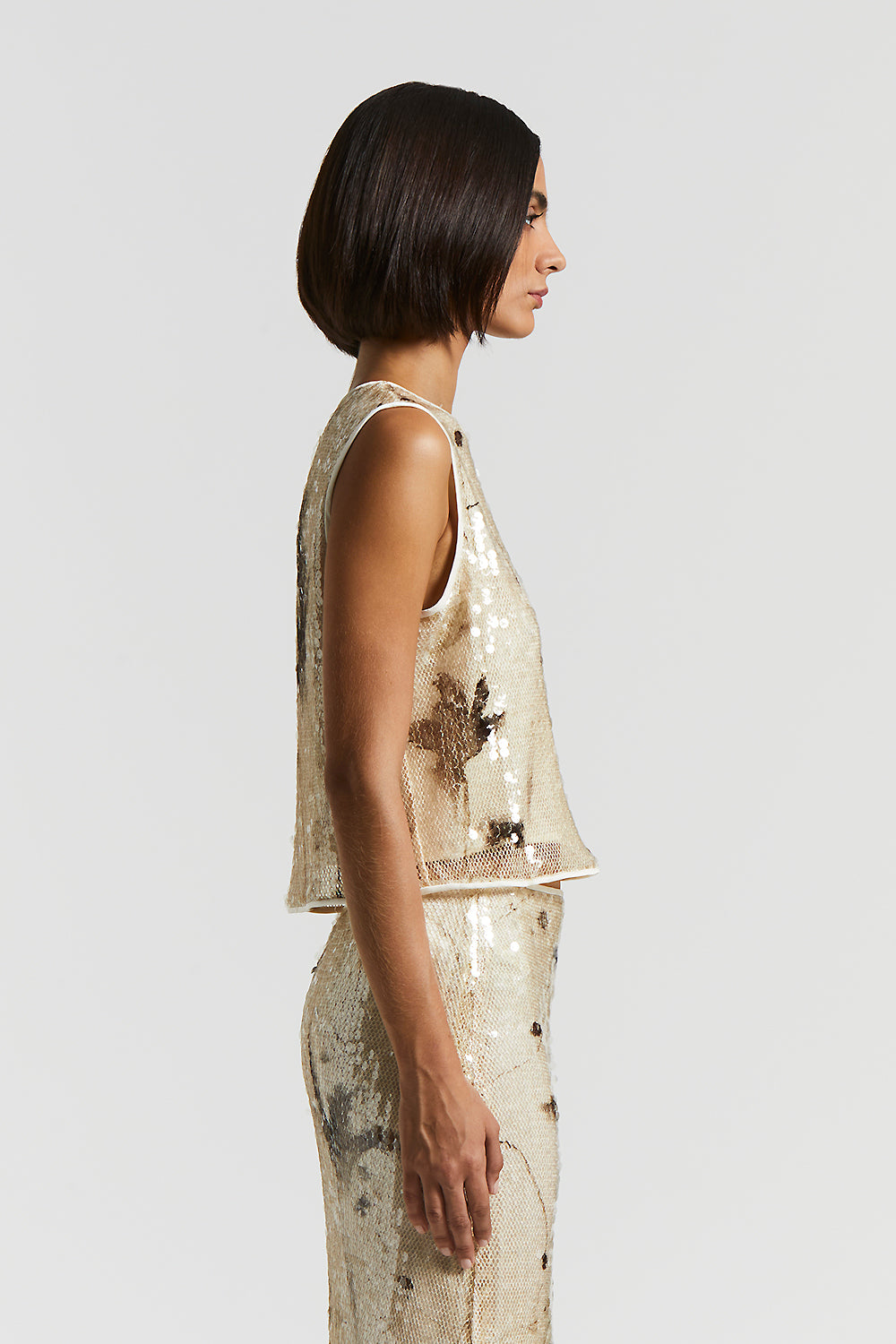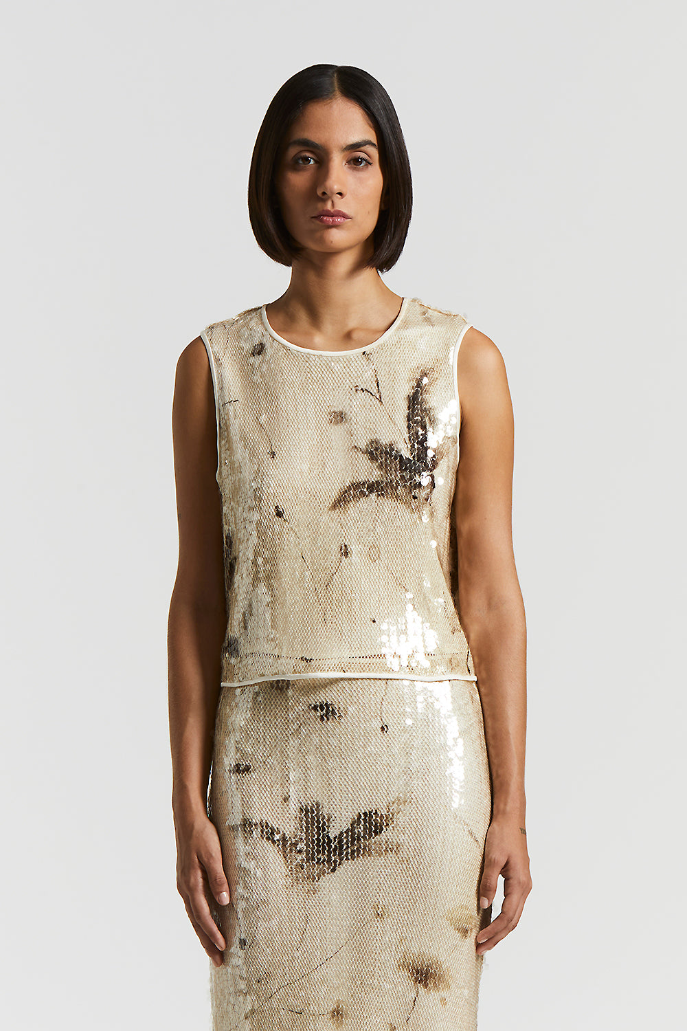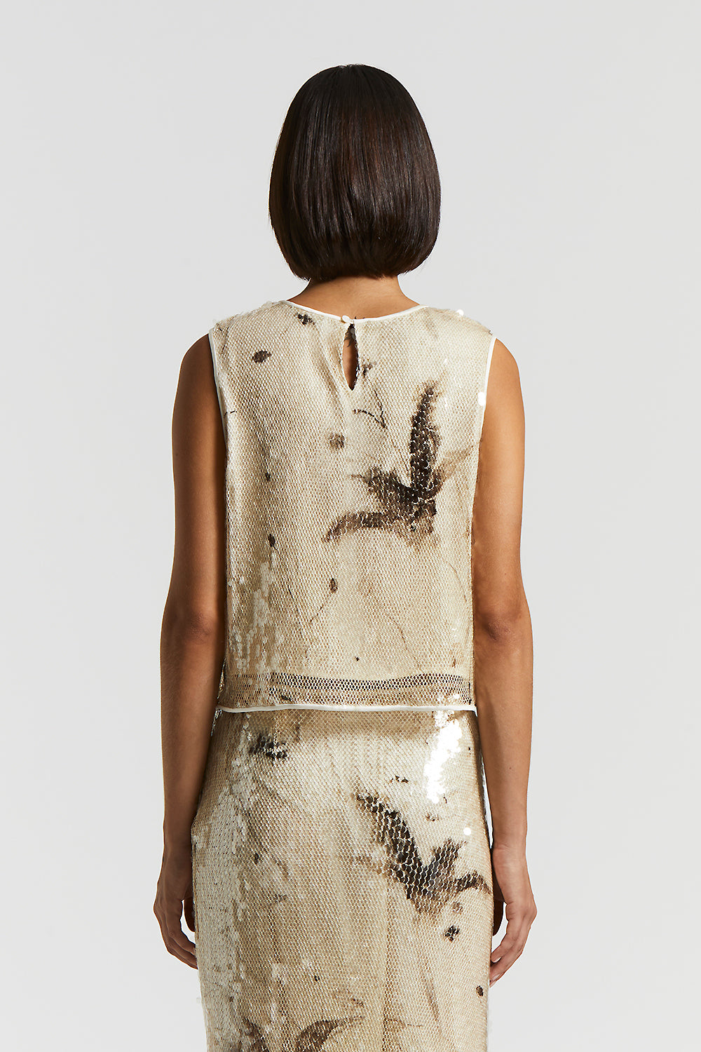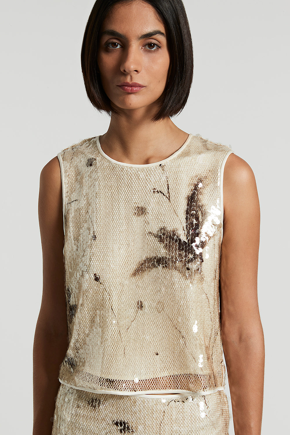 Sleeveless crew neck top in Lurex net featuring sequins printed with floral motifs that catch the light with a sparkling and sophisticated effect.