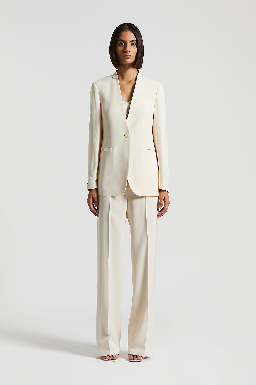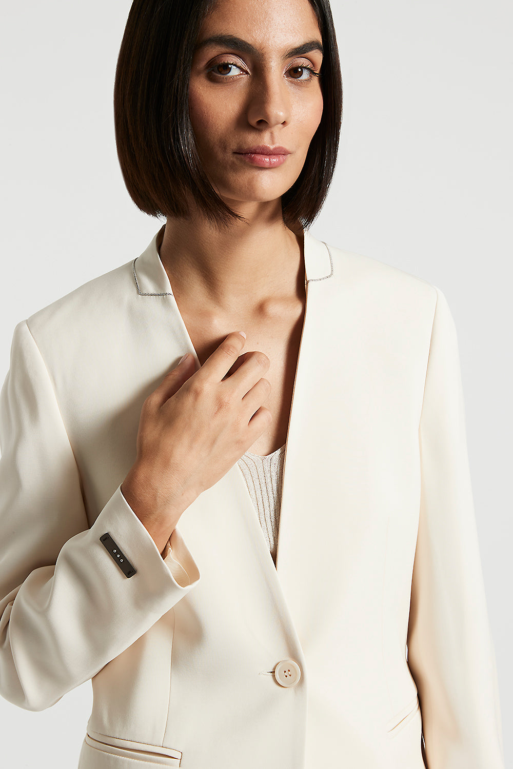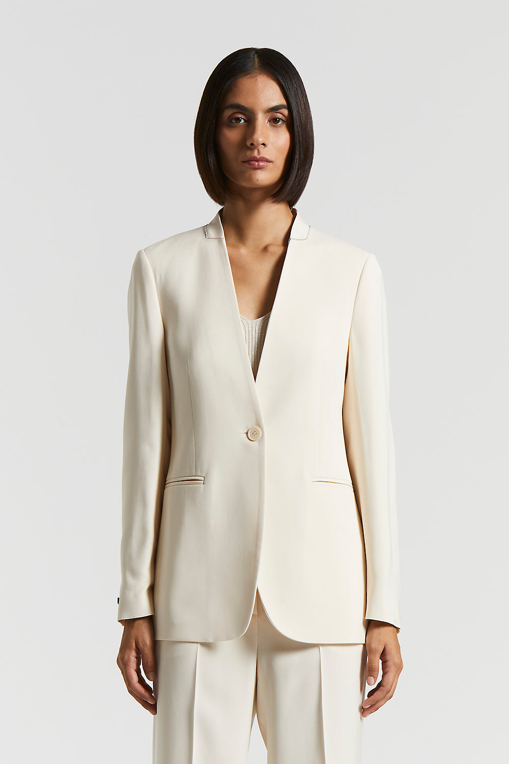 Single-breasted collarless jacket with one button for an essential and contemporary design.