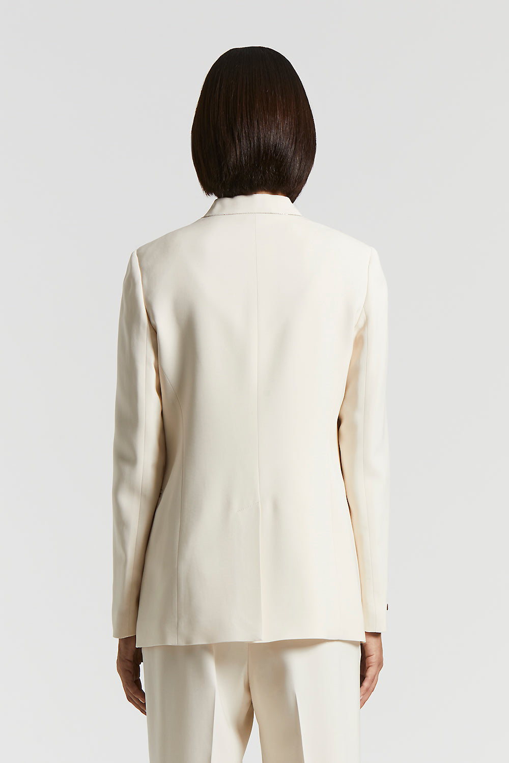 Single-breasted collarless jacket with one button for an essential and contemporary design.Made of stretch viscose cady, a soft and slightly stretch fabric, this jacket is perfect for elegant, dynamic…