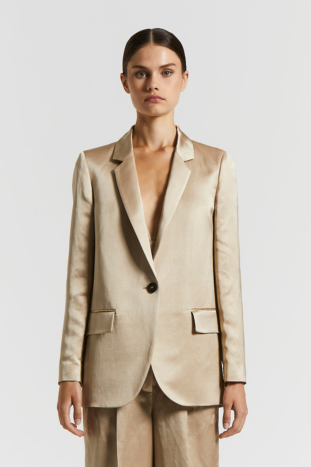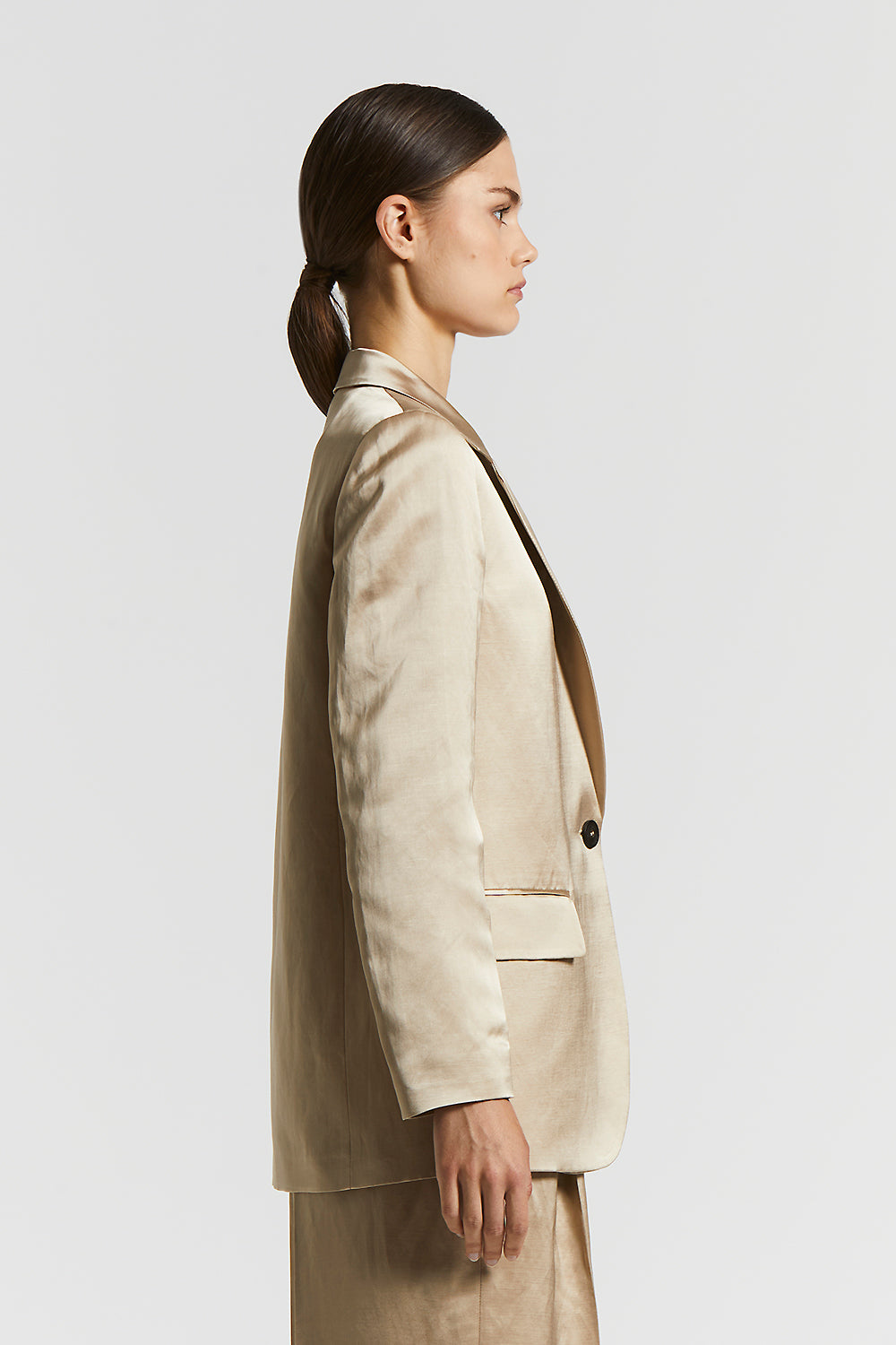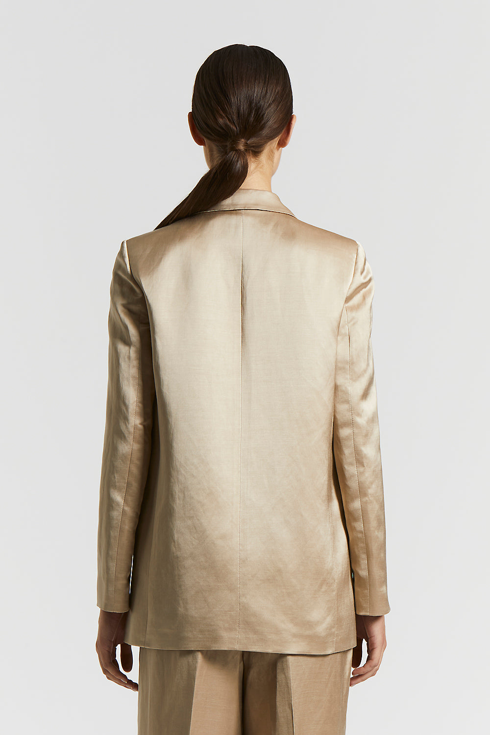 Essential elegance takes on a sheen in this single-breasted blazer, where the softness of viscose and the natural refinement of linen blend in luminous satin.