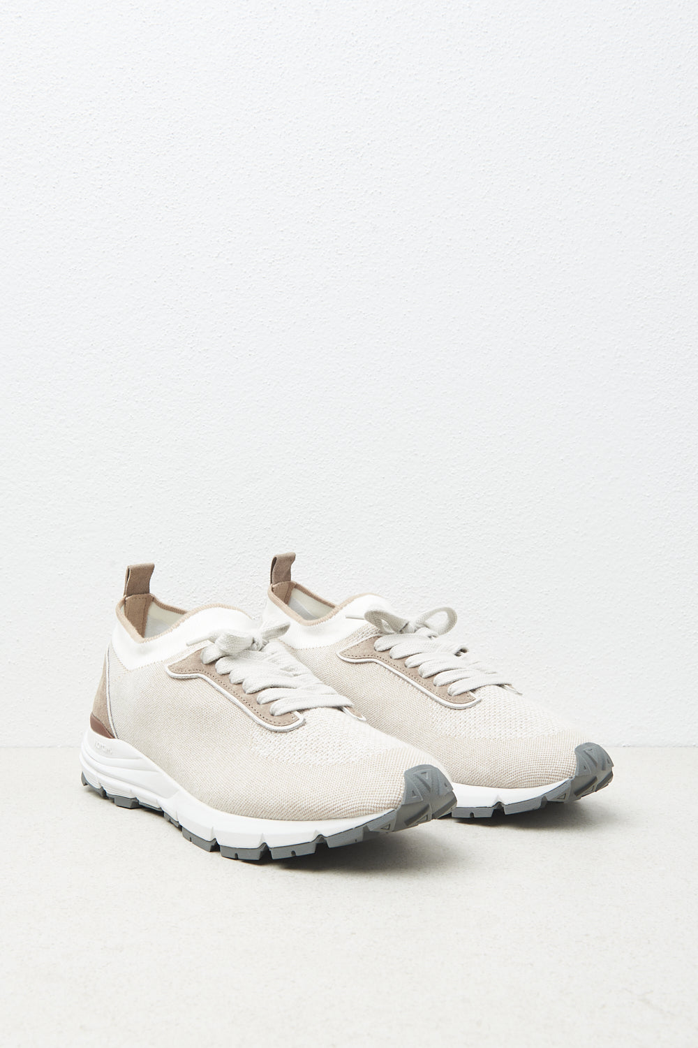 Melange stretch knit sneakers embellished with elegant suede inserts.The three-colour light Vibram sole and cotton laces express a perfect balance of comfort and style. Peserico logo on the heel.