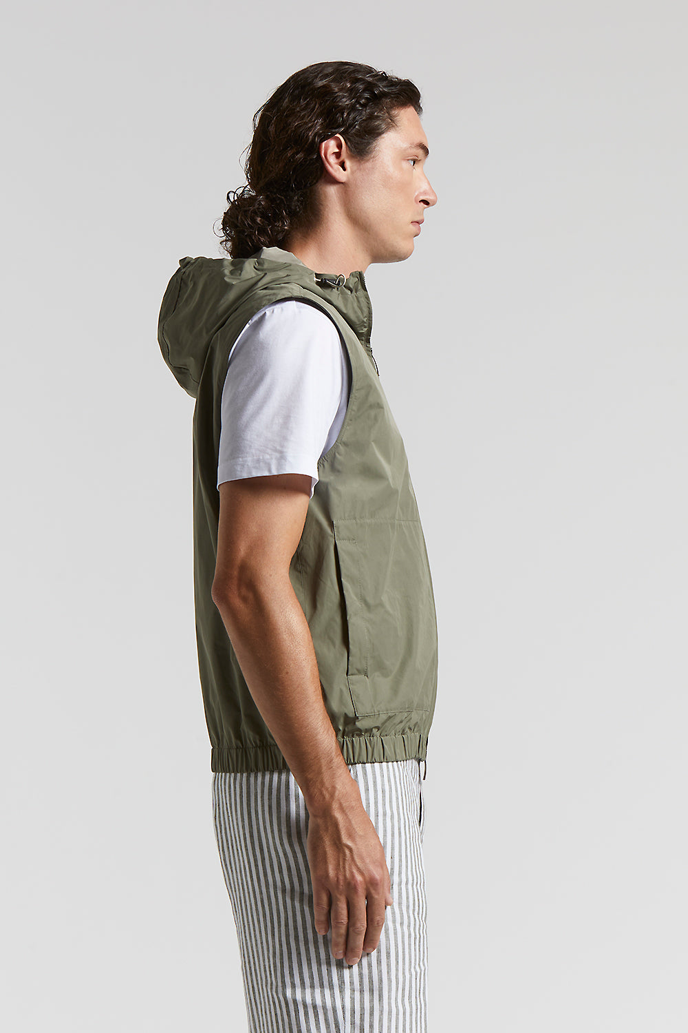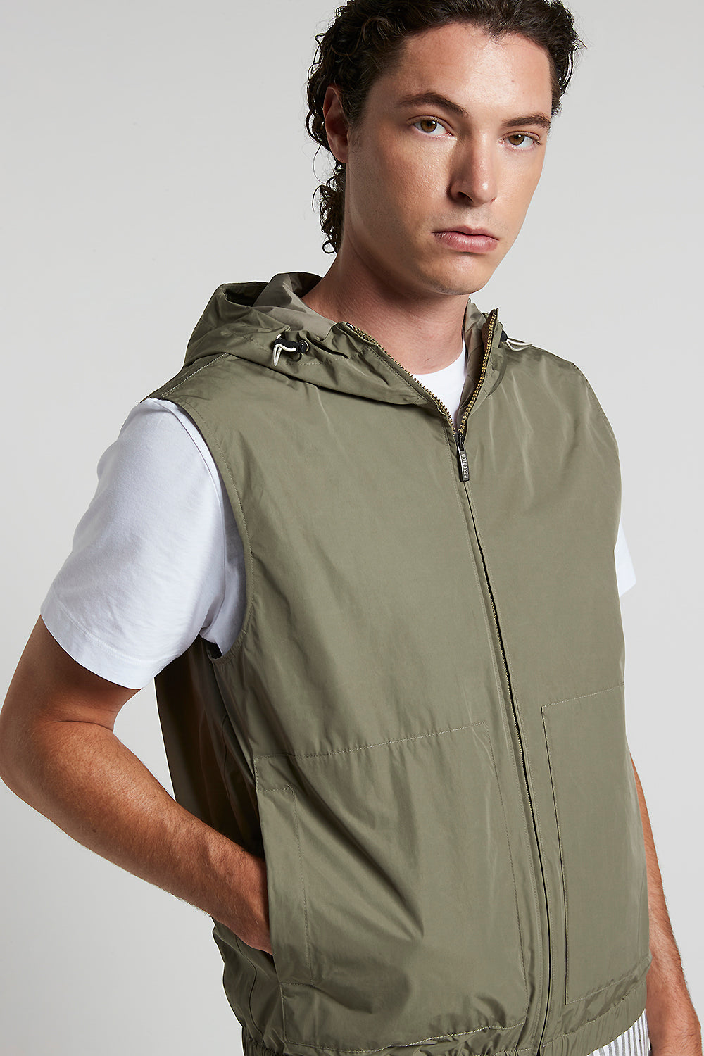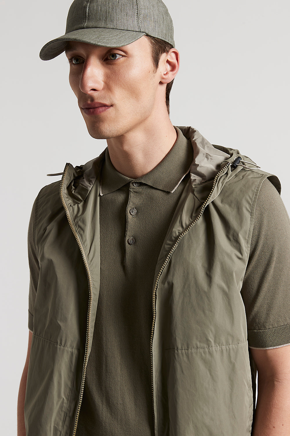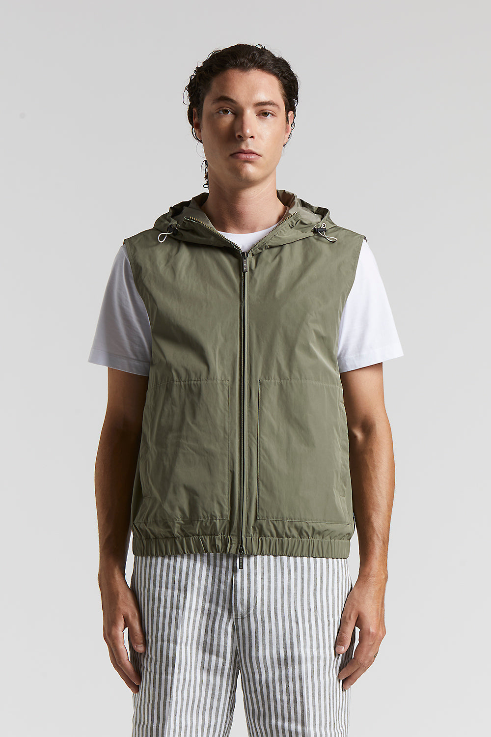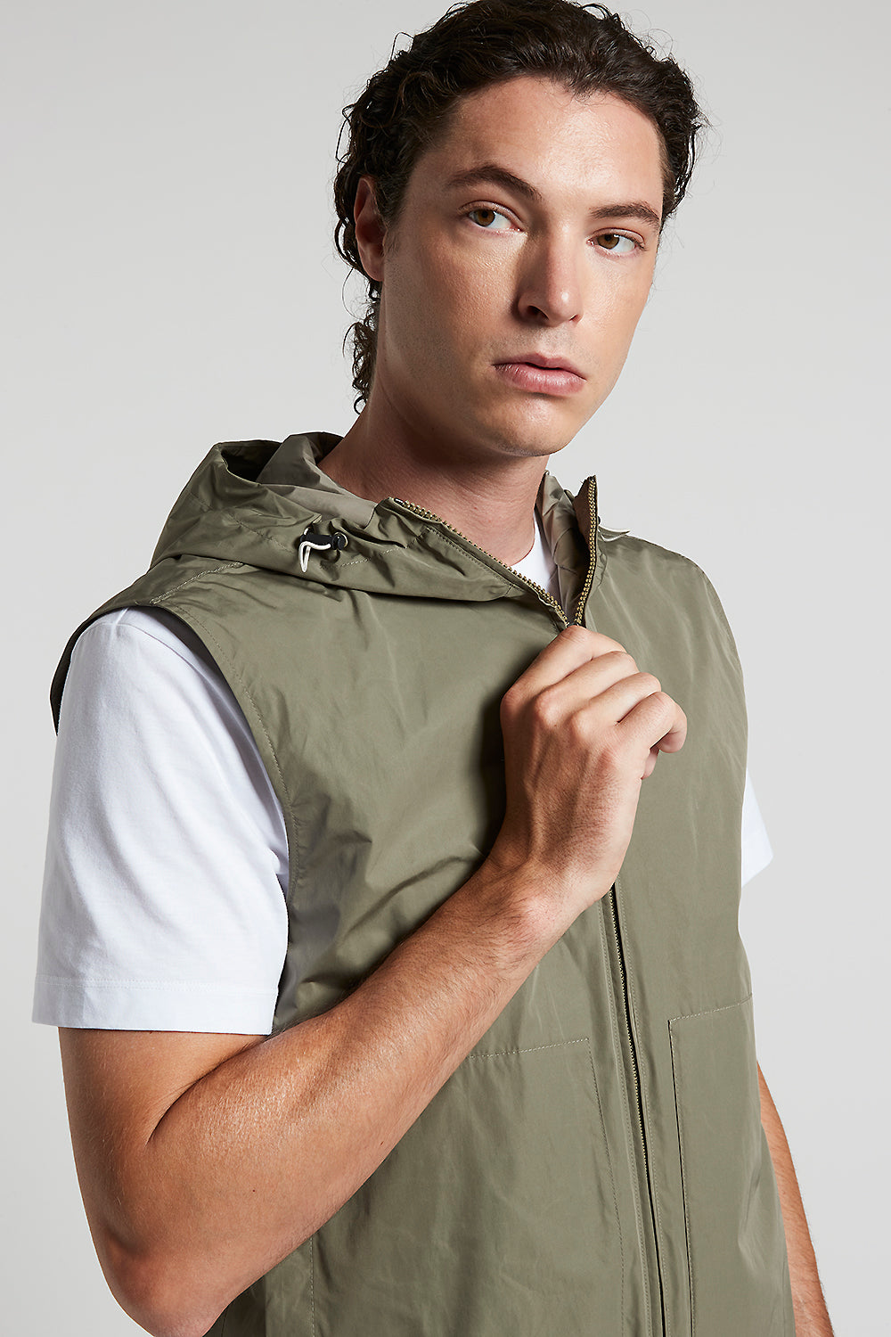 Gilet in light, water repellent Solotex® technical fabric, designed to offer practicality and strength without forgoing style.Rounded elastic drawstring and adjusters on the hood make for a perfect fi…