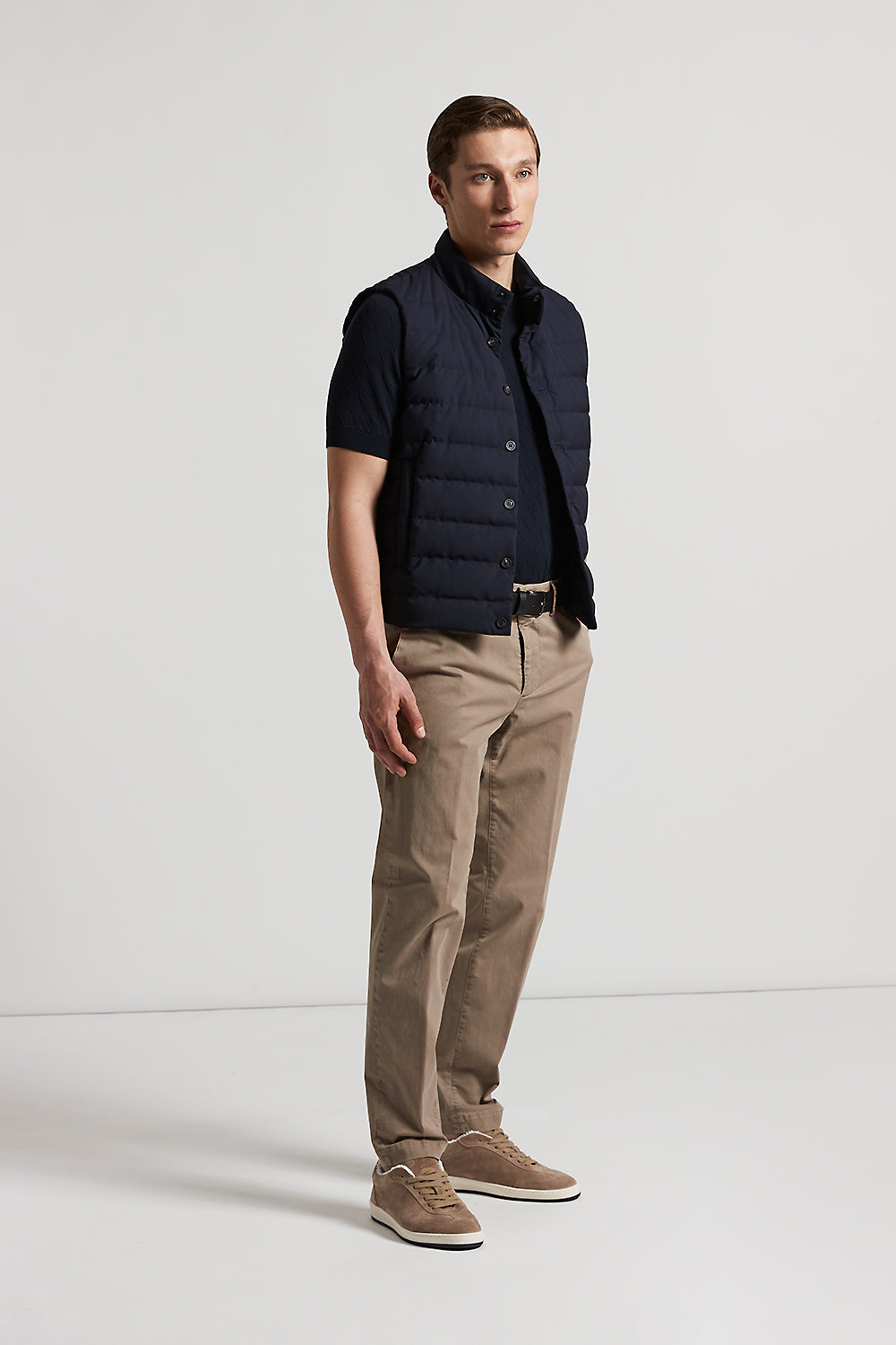 Garment dyed light stretch cotton gabardine offers a feeling of freshness and durability, keeping its shape and colour unaltered.