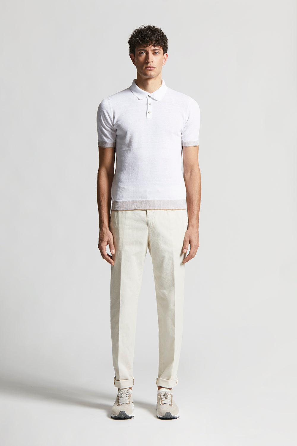 Light, natural stretch cotton gabardine features a lively texture and elastic properties that ensure a relaxed, fluid fit.