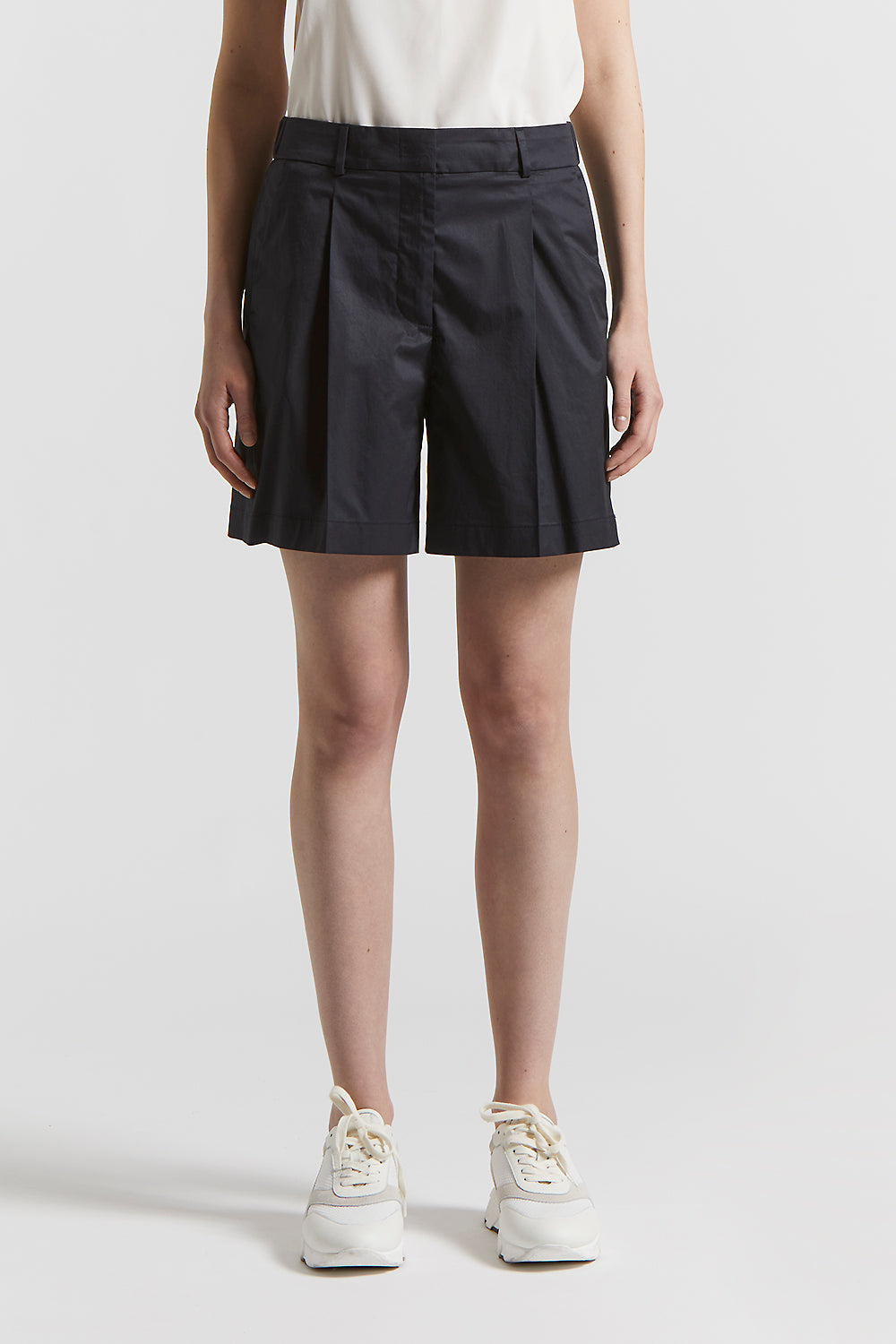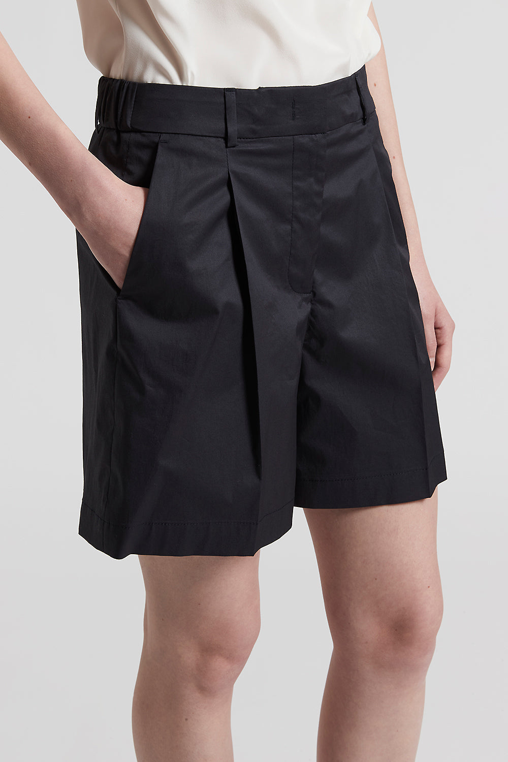Minimal and refined, these shorts in smooth touch light stretch cotton satin envelop the body with softness that lightly brushes the skin.Pleats delicately define the line, while a relaxed fit and reg…