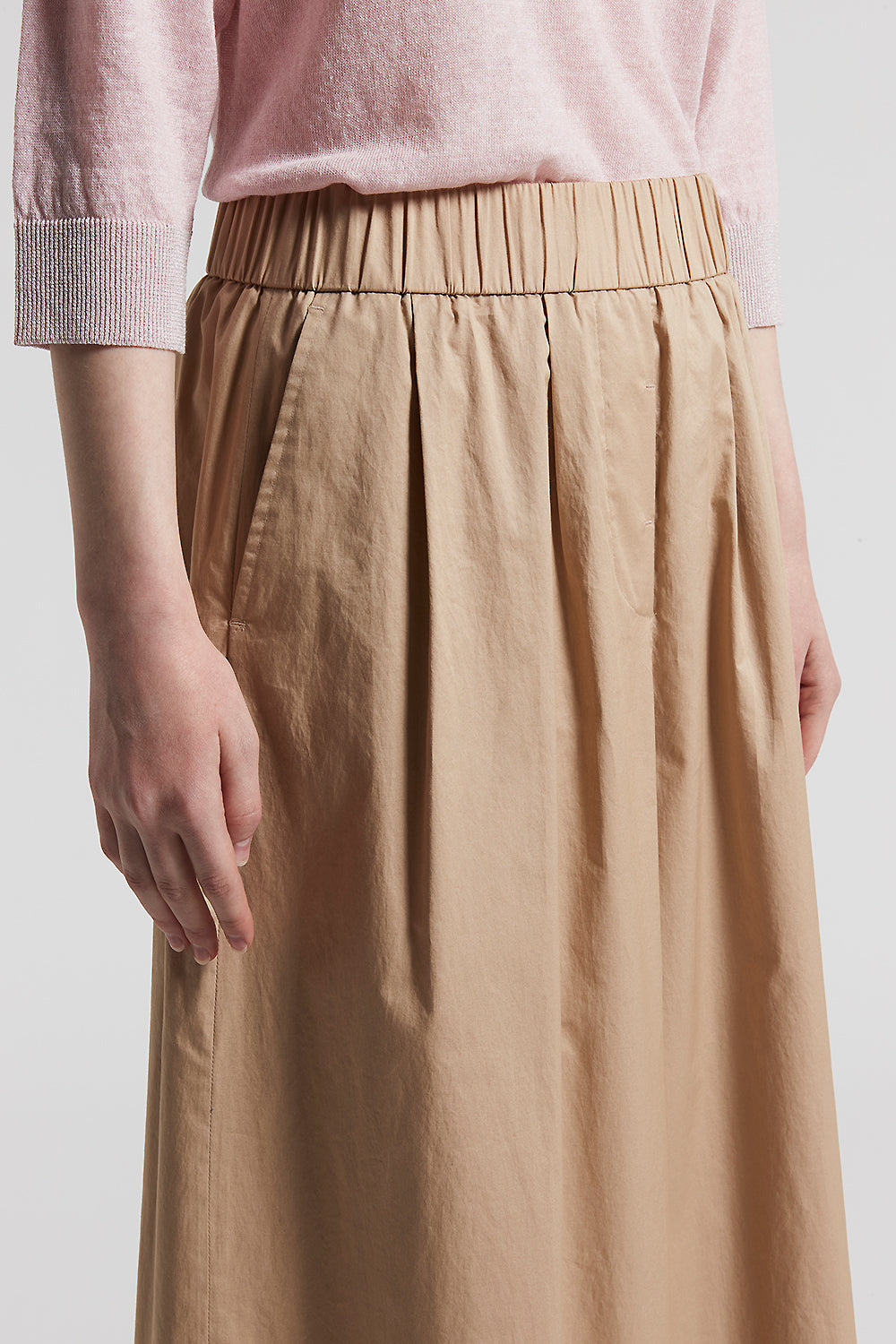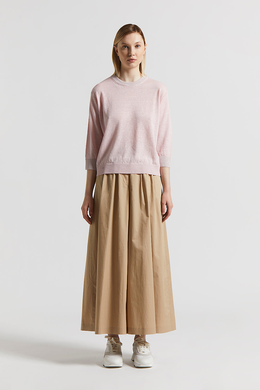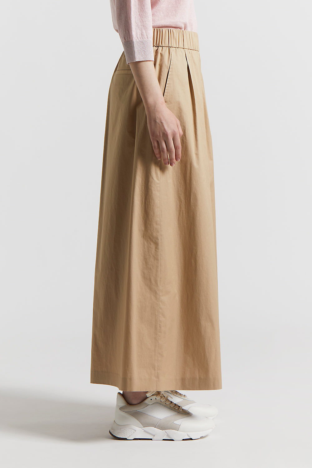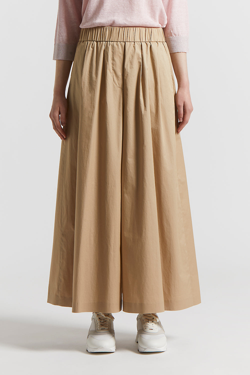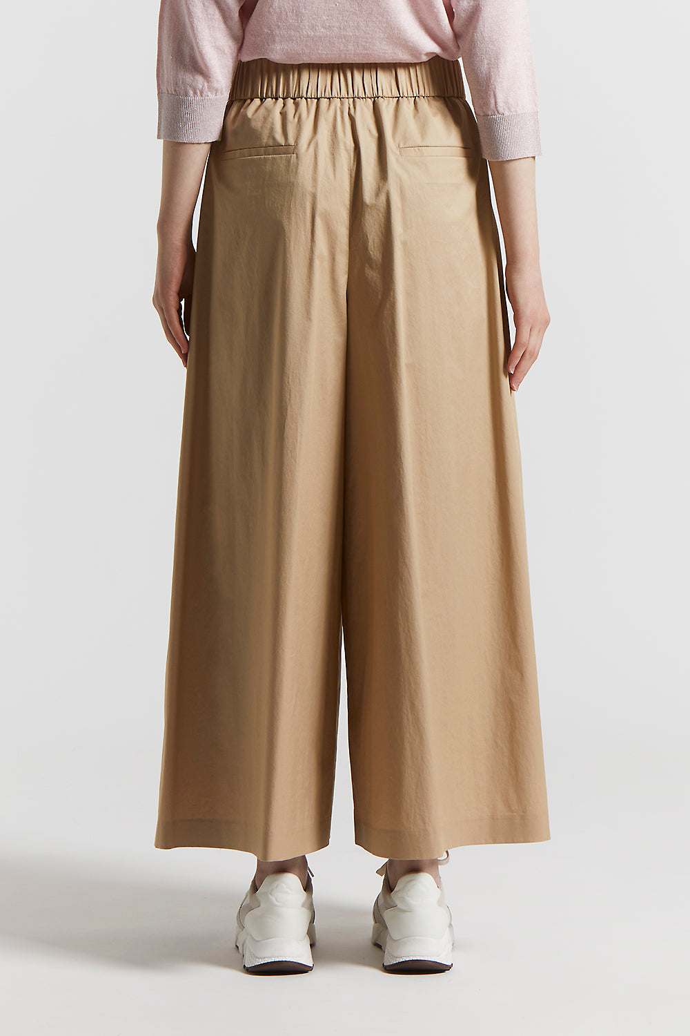 A perfect balance between fluidity and structure, these cropped trousers in smooth touch light stretch cotton satin combine the lightness of the fabric with the precision of the pleats.