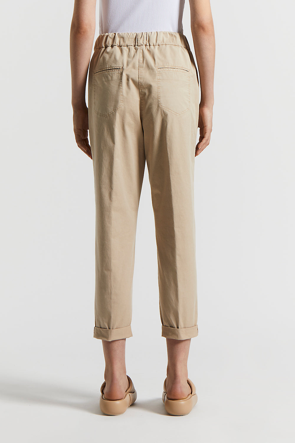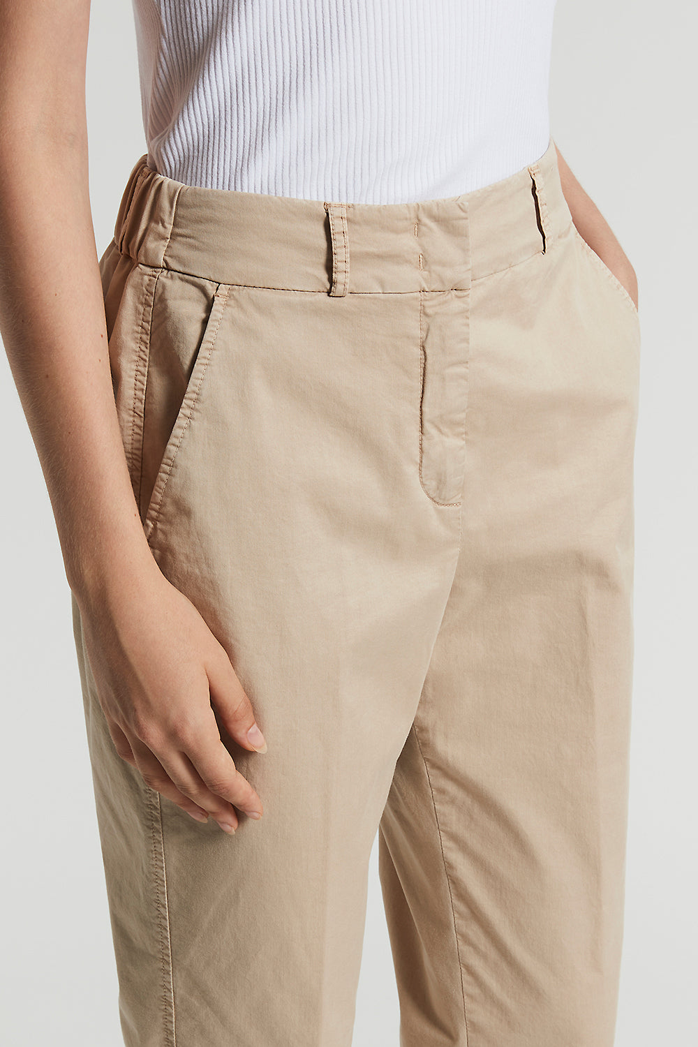 Versatile and contemporary, these trousers in garment dyed stretch denim combine comfort and style.The elastic back waistband ensures a relaxed, fluid fit, while the regular waist defines the figure w…