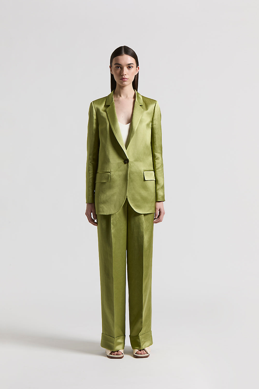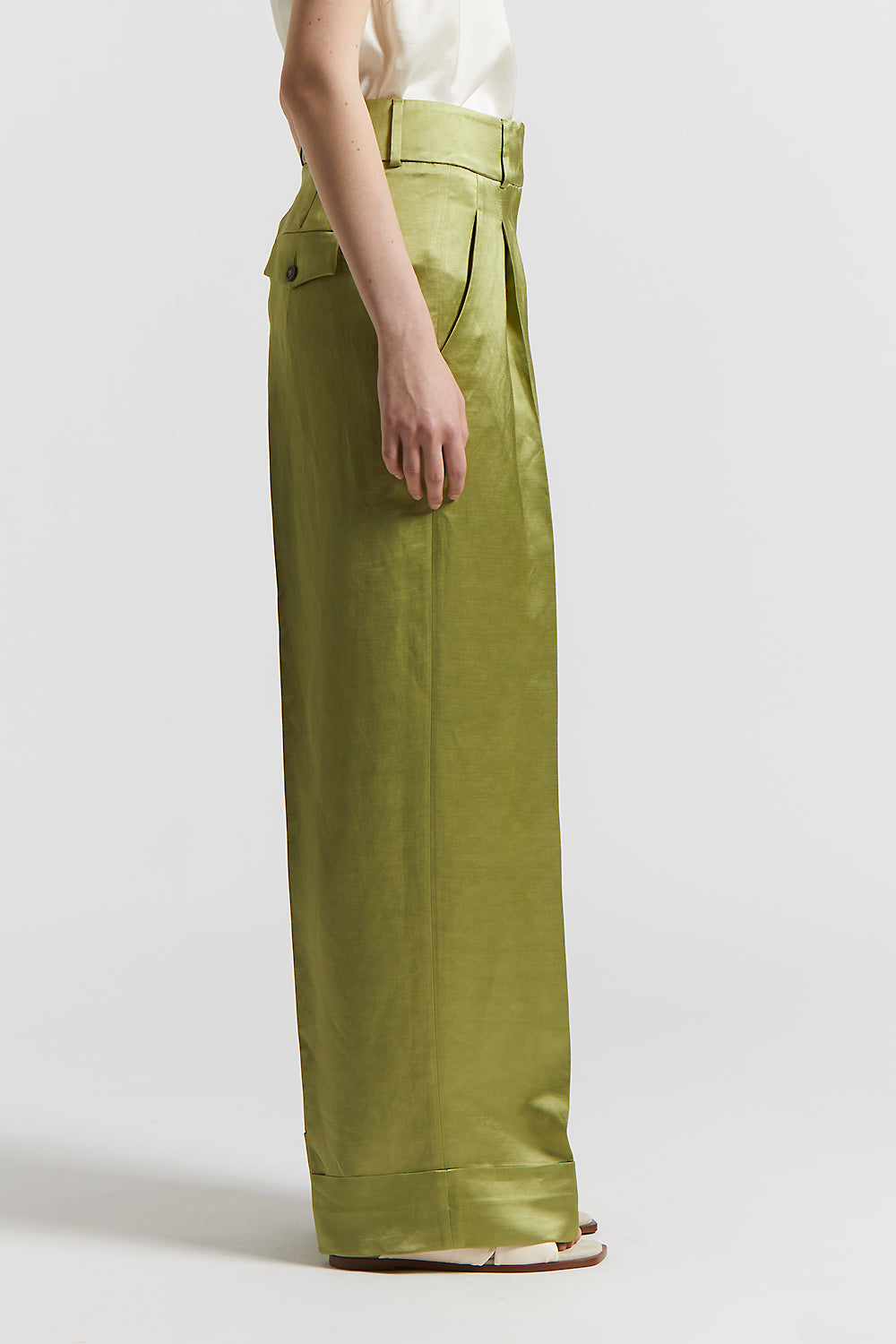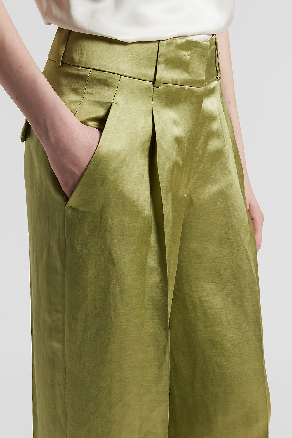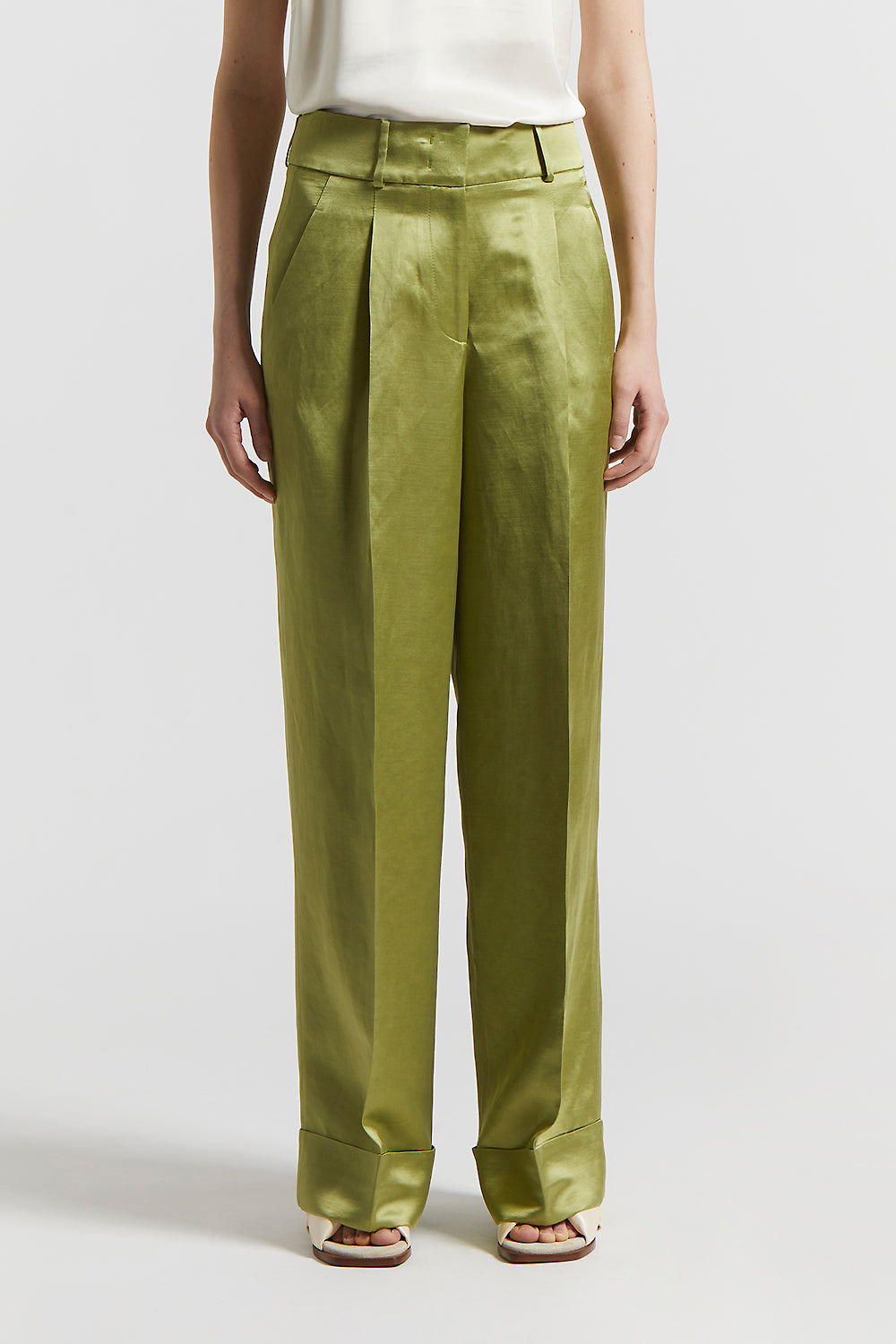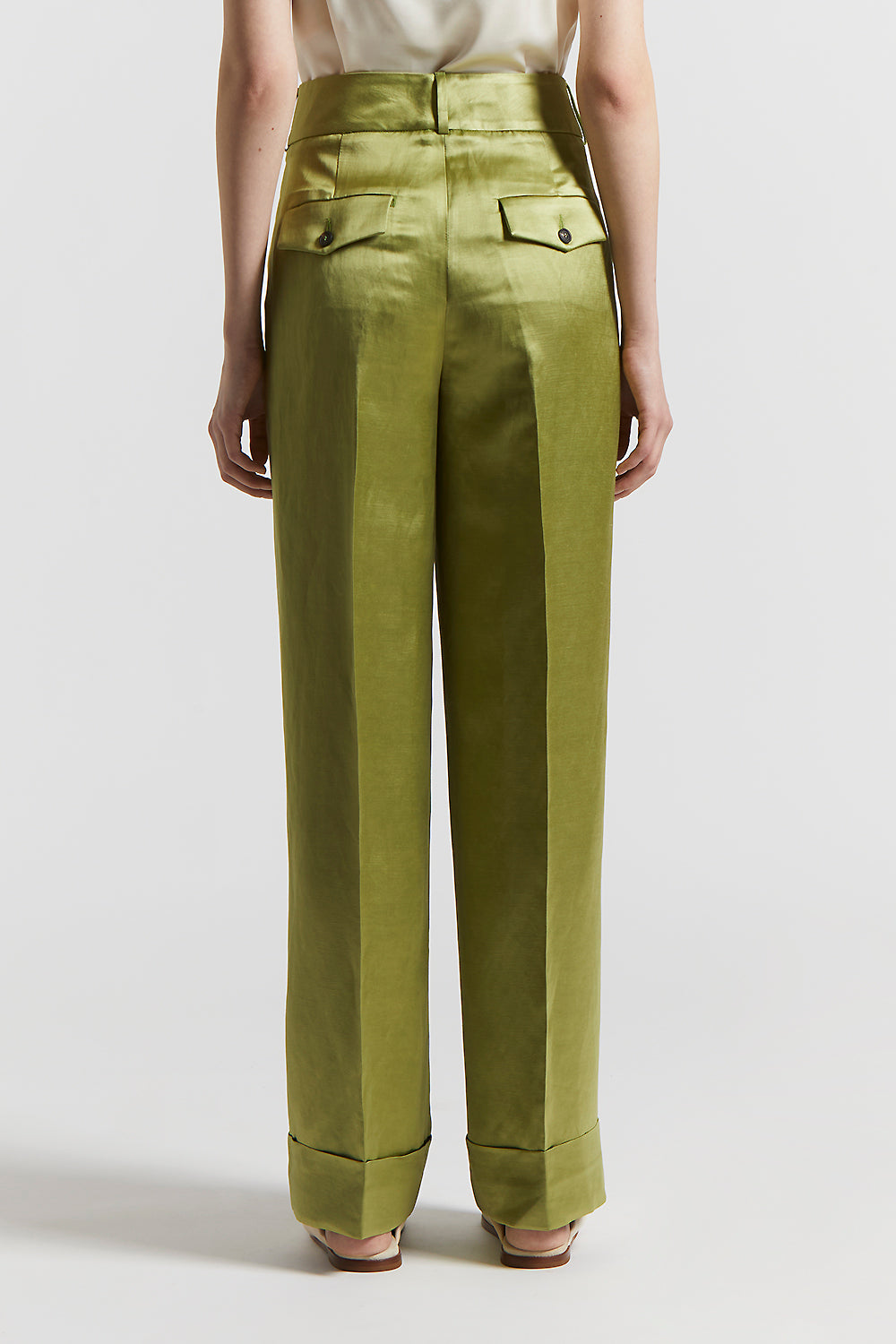 A play of volumes and light characterize these viscose and linen satin palazzo trousers, where deep pleats provide structure and movement.