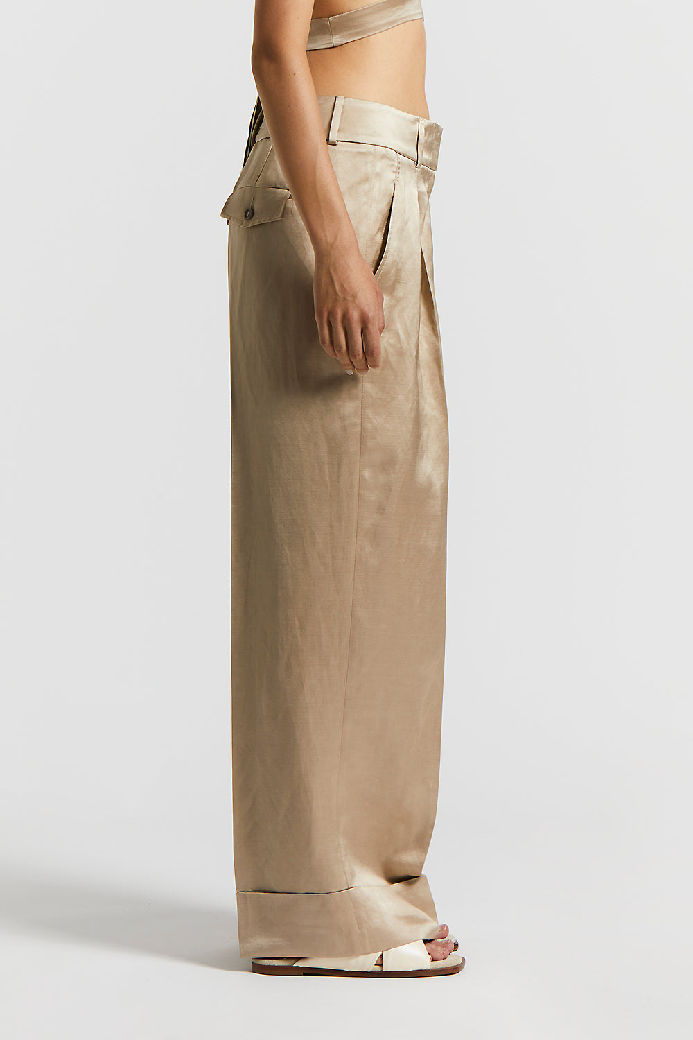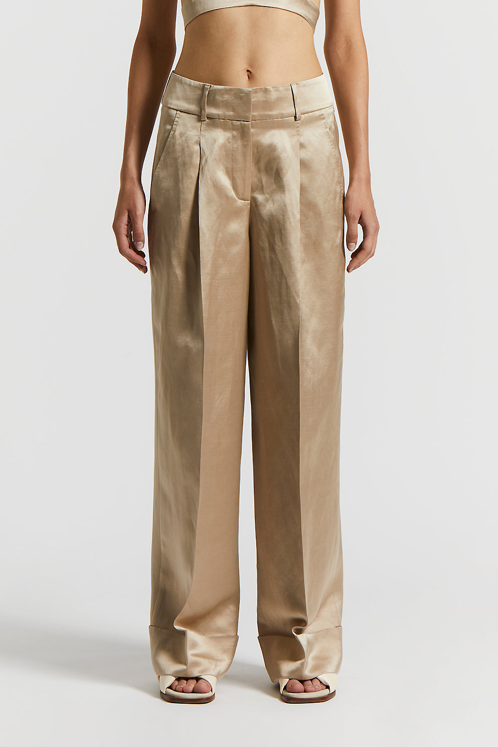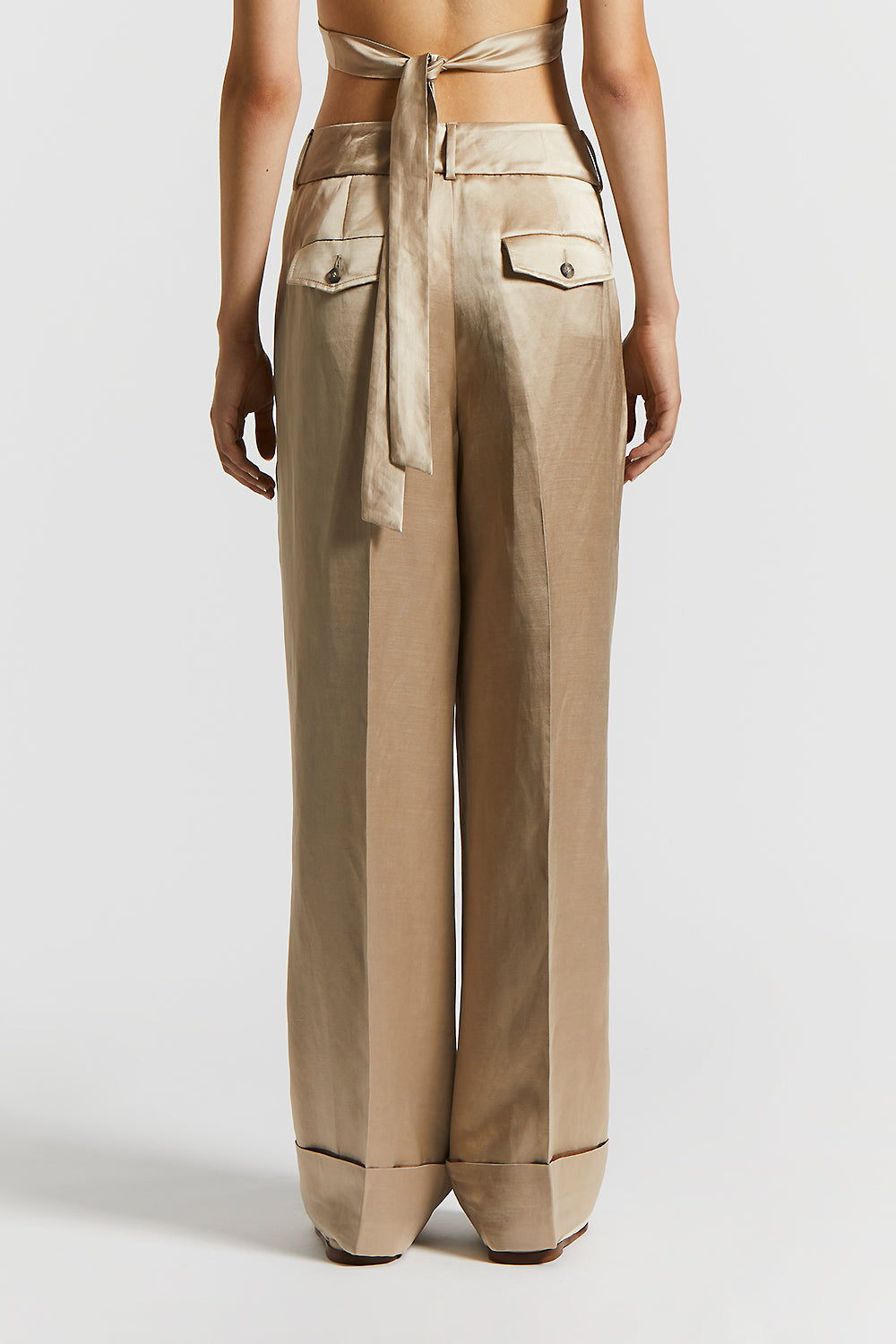 A play of volumes and light characterize these viscose and linen satin palazzo trousers, where deep pleats provide structure and movement.