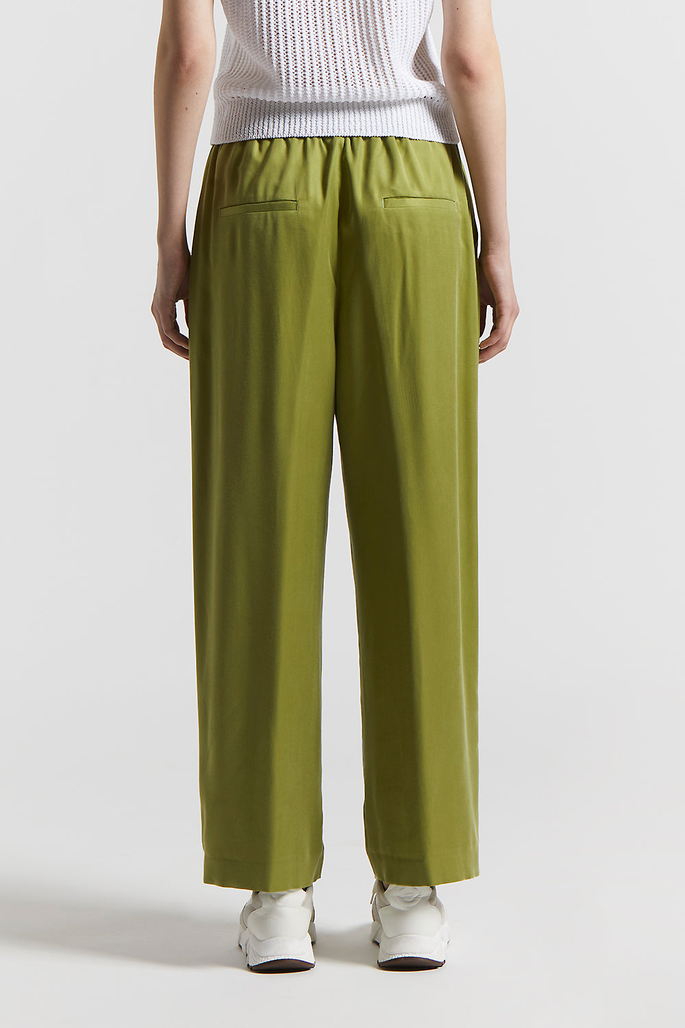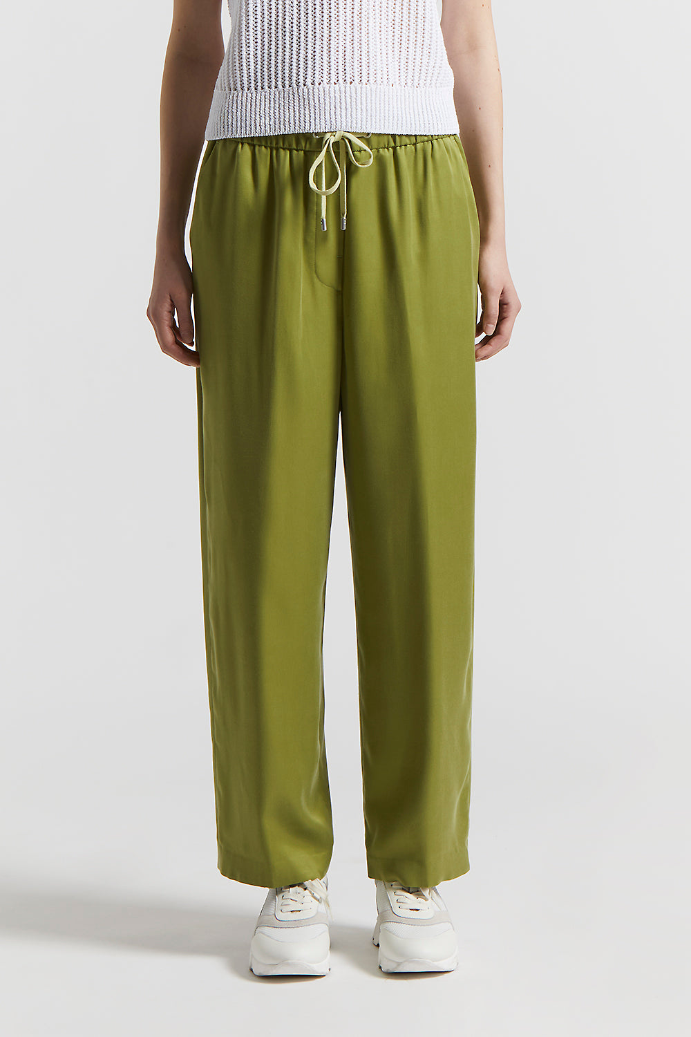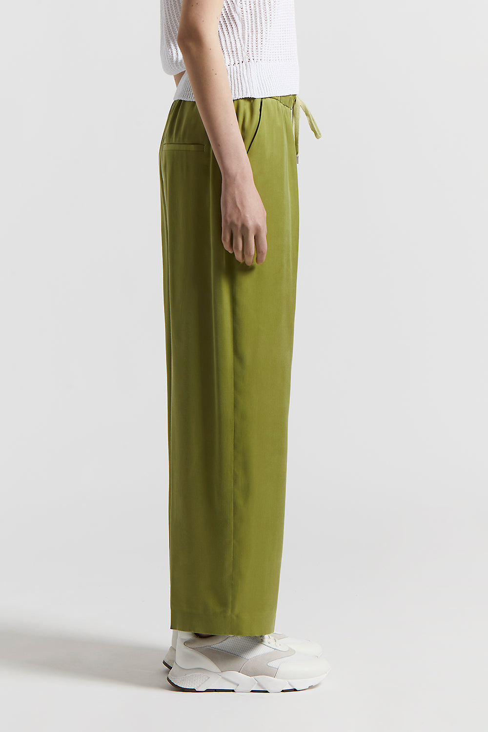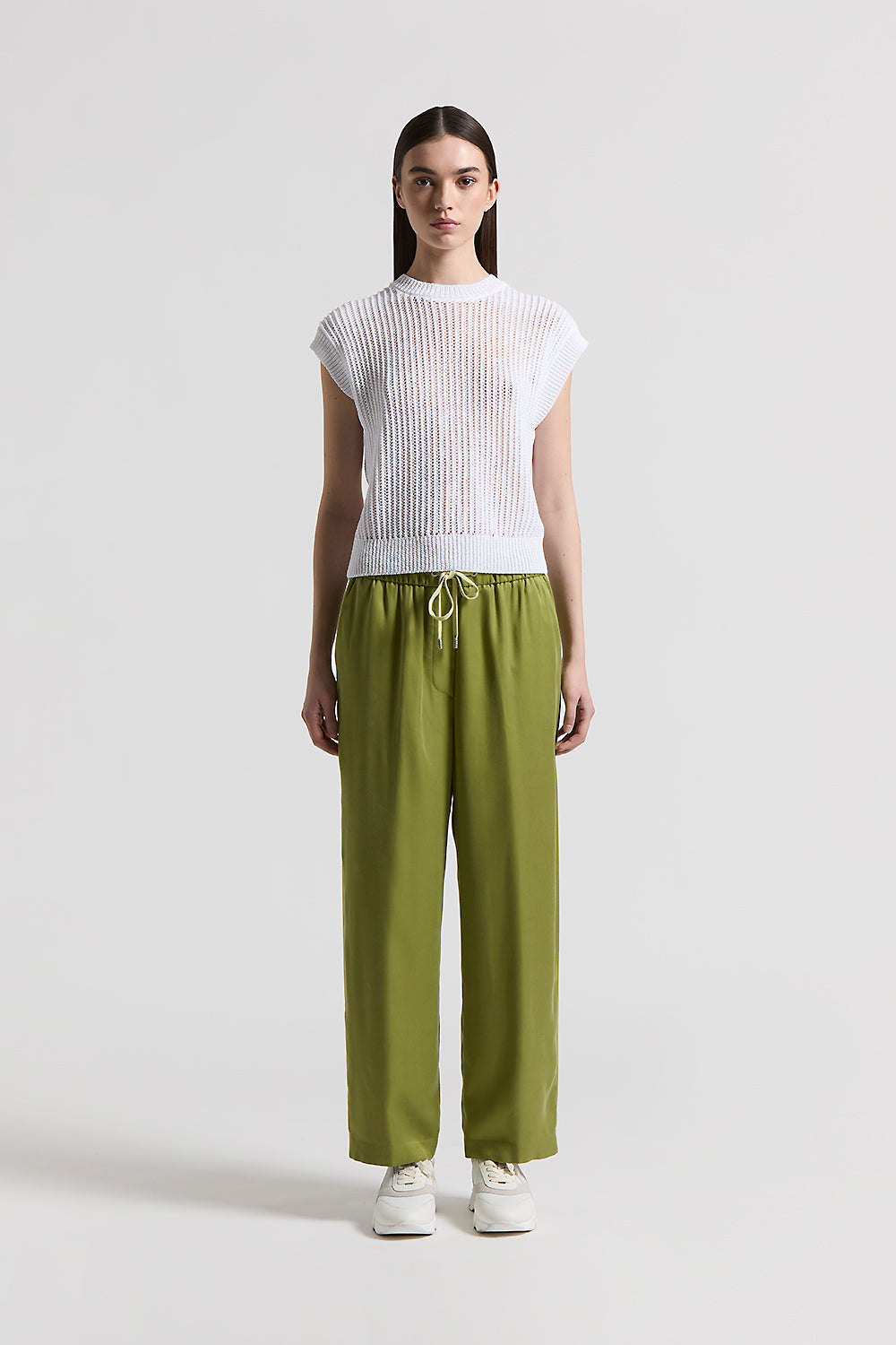 Lightness becomes style in these trousers with a velvety texture, as enveloping as a caress with a refined peachskin touch.The elasticated high waist with drawstring ensures comfort and fluidity, whil…