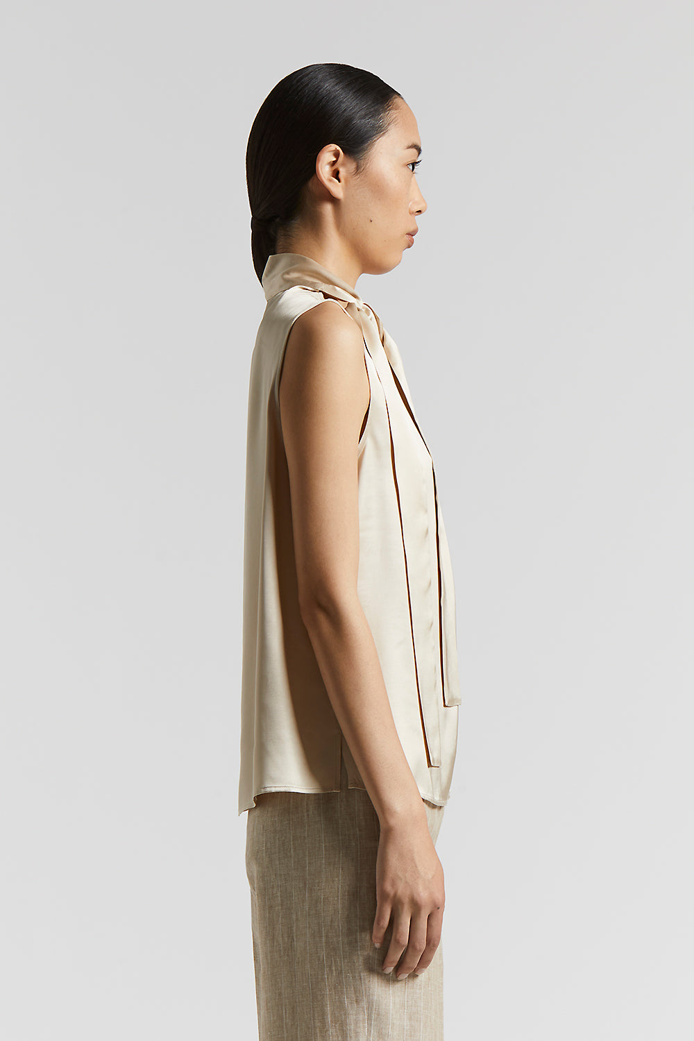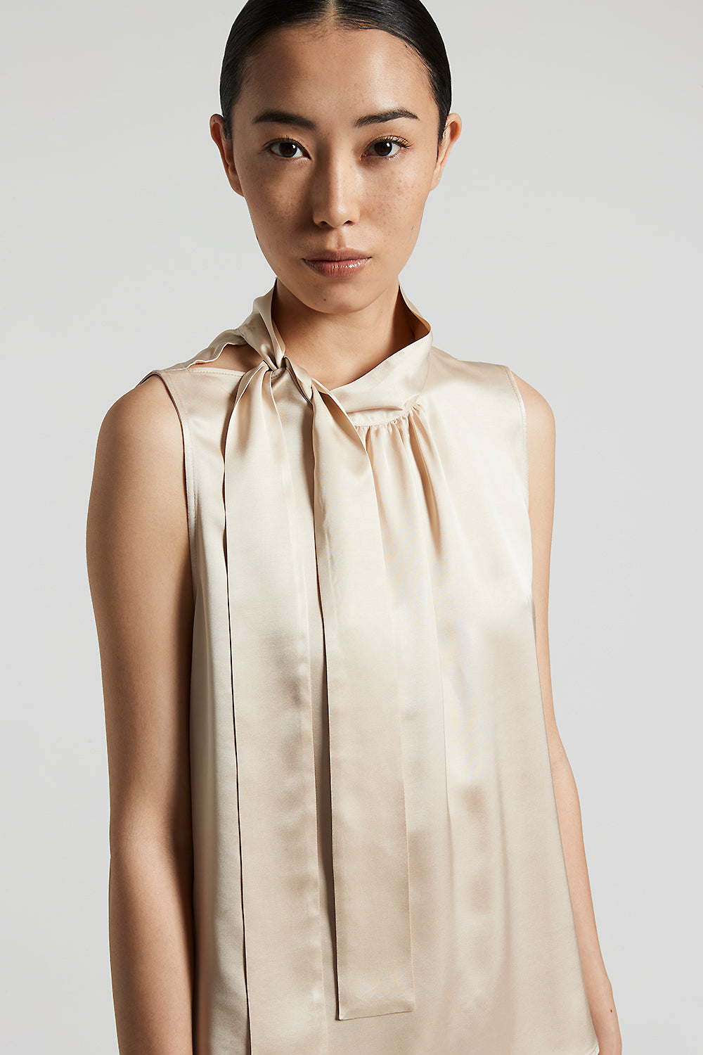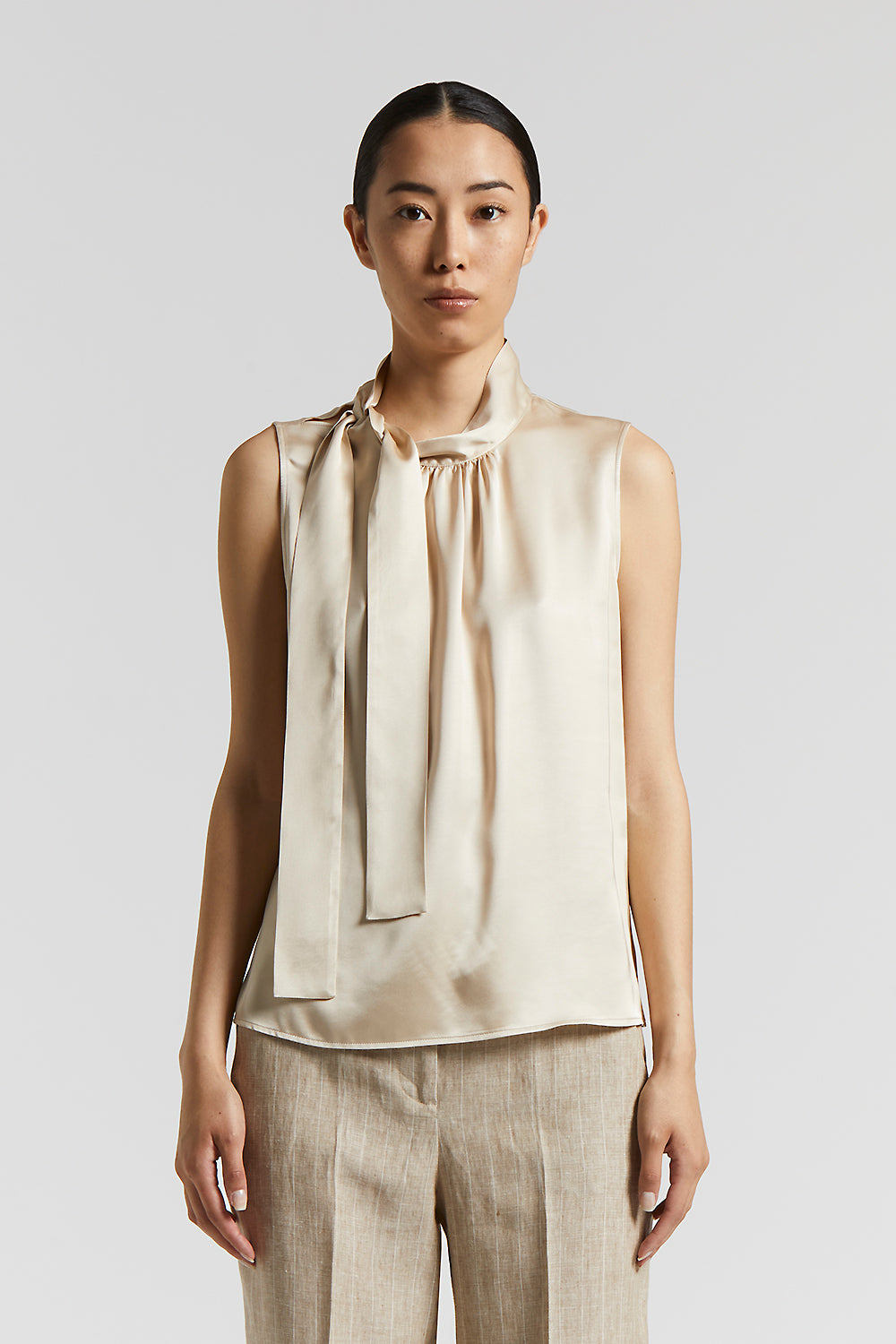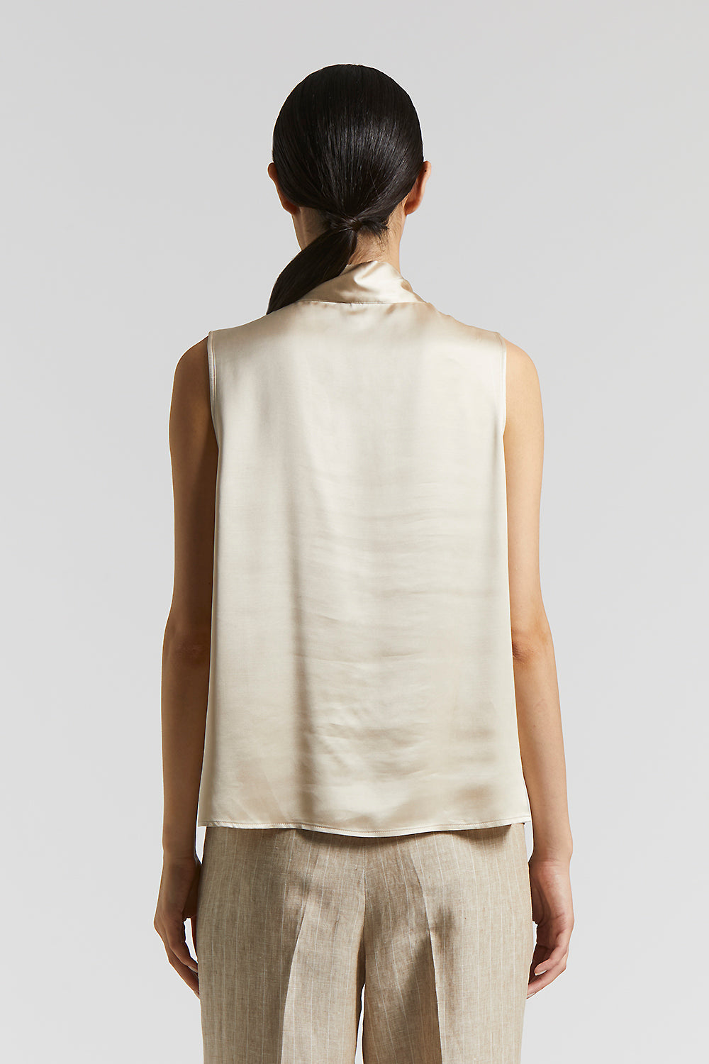 This sleeveless top in soft viscose satin is sophisticated and versatile. The tie at the neck with gathers at the neckline lend an original touch of sophistication.
